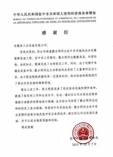 近日,公司收到中華人民共和國(guó)駐中非共和國(guó)大使館經(jīng)濟(jì)商務(wù)參贊處發(fā)來(lái)的感謝信,信中對(duì)我公司戴吉周同志在駐中非使館經(jīng)商參處水電路維修改造工程中的優(yōu)異工作表現(xiàn)表示衷心感謝。