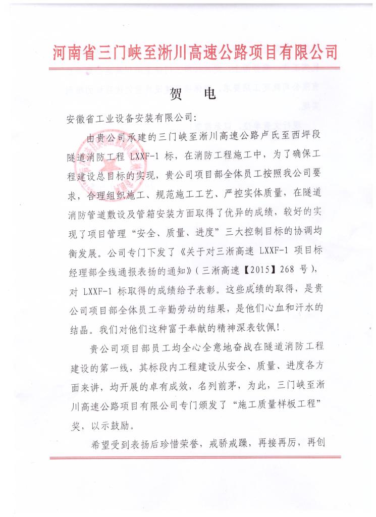 10月5日,公司收到河南省三門峽至淅川高速公路項目有限公司發(fā)來的賀電,信中對公司西北分公司在承建三門峽至淅川高速公路盧氏至西坪段隧道消防工程LXXF-1標施工中,項目部合理組織施工、規(guī)范施工工藝、嚴控實體質量,較好地實現(xiàn)了項目“安全、質量、進度”三大控制目標協(xié)調均衡發(fā)展表示高度贊揚,對項目部全體員工辛勤勞動、無私奉獻表示衷心感謝,并給予表彰和獎勵。