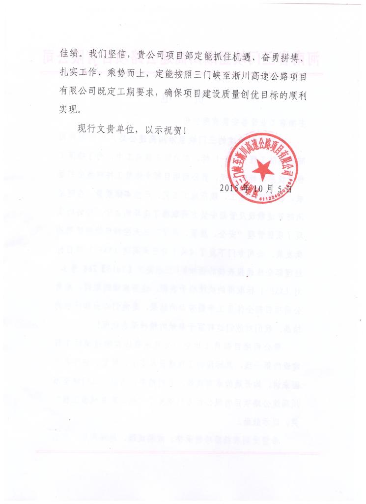 河南省三門峽至淅川高速公路項目有限公司向公司發(fā)來賀電