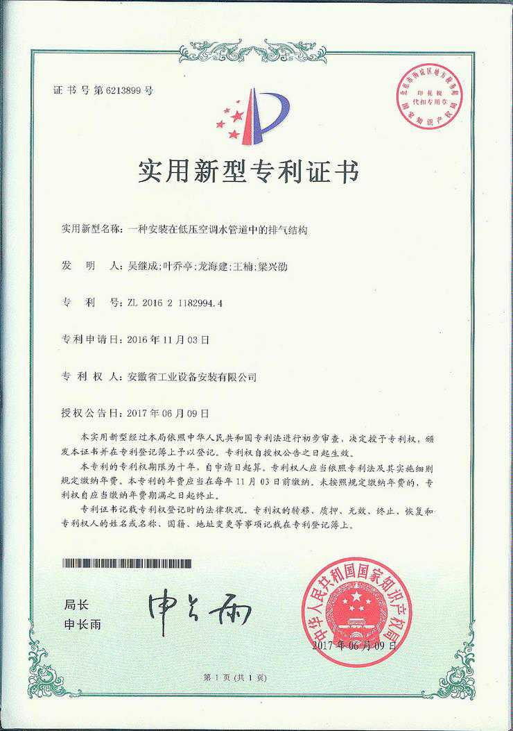 近日,由安徽安裝公司申報的《一種安裝在低壓空調(diào)水管道中的排氣結構 》實用新型項目,正式獲得國家知識產(chǎn)權局授權,并頒發(fā)了實用新型專利證書(專利號:ZL201621182994.4)。這是繼《一種便攜式施工現(xiàn)場臨時用電聯(lián)排插座》之后獲得的第二項專利。