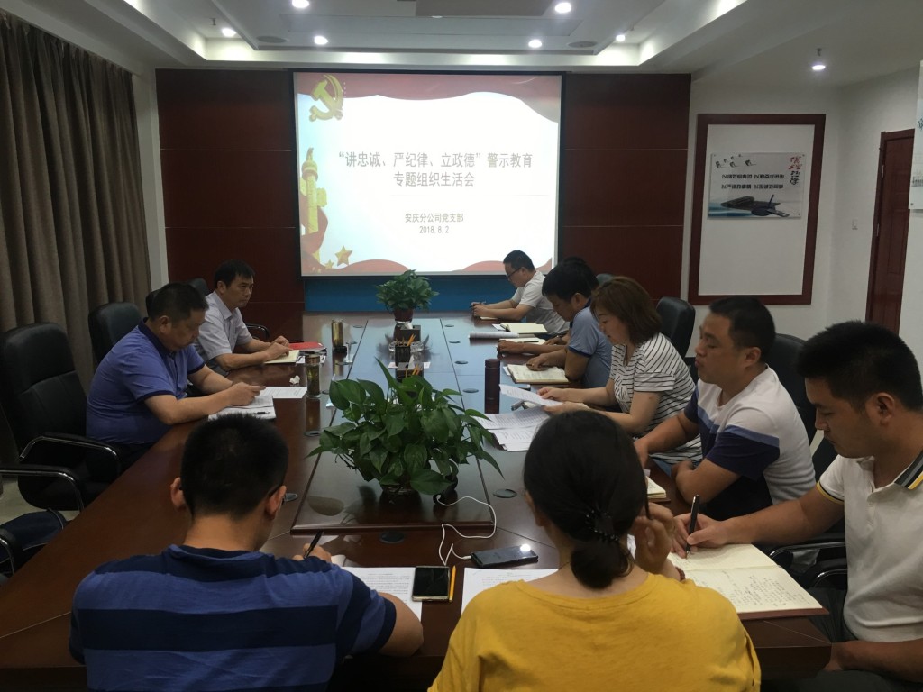 8月2日下午,安慶分公司黨支部組織召開了“講忠誠、嚴(yán)紀(jì)律、立政德”警示教育專題組織生活會,公司董事長、總經(jīng)理、黨委副書記王軍邦,紀(jì)委書記、工會主席李寬旭到會指導(dǎo)。分公司領(lǐng)導(dǎo)班子成員、支部黨員參加了會議,會議由分公司黨支部書記劉紅艷主持。