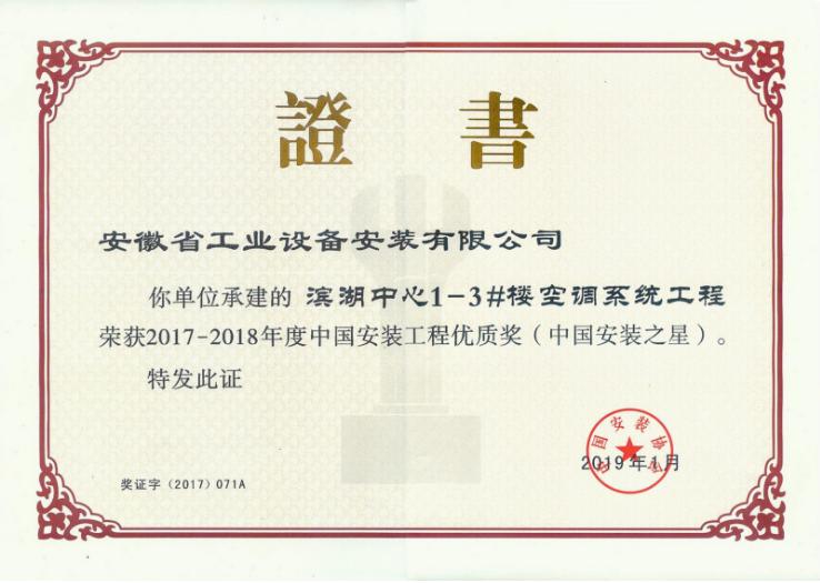 2019年4月17日,中國(guó)安裝協(xié)會(huì)在珠海召開第六屆七次理事(擴(kuò)大)會(huì)議暨工程創(chuàng)優(yōu)經(jīng)驗(yàn)交流會(huì),會(huì)上表彰了2017-2018年度中國(guó)安裝工程優(yōu)質(zhì)獎(jiǎng)(中國(guó)安裝之星),安徽安裝承建的“合肥市濱湖中心1#-3#樓空調(diào)系統(tǒng)工程”項(xiàng)目榮獲該項(xiàng)榮譽(yù)。