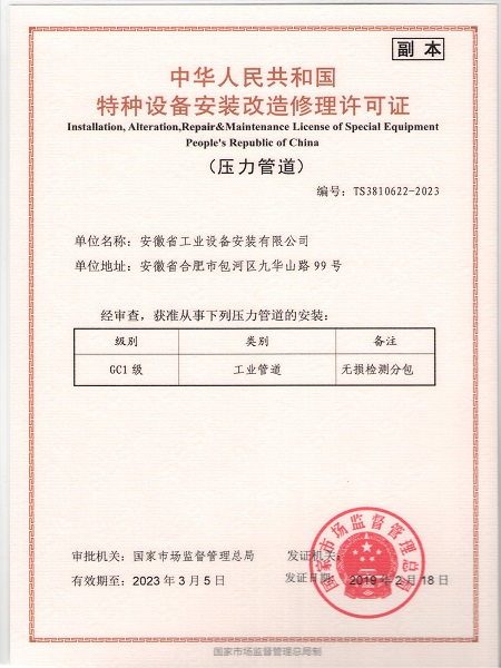 特種設備安裝改造維修許可證(壓力管道)