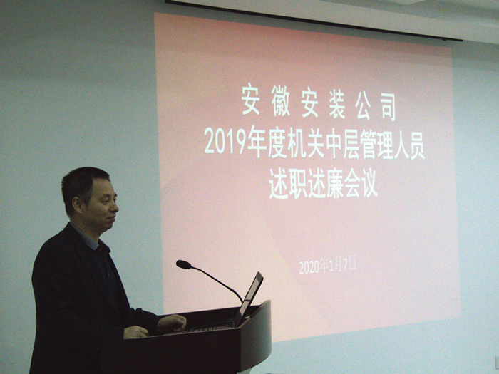 1月7日上午,安徽安裝公司召開2019年度機關中層管理人員述職述廉會議。公司領導班子成員、機關中層管理人員、分公司黨政負責人、機關部門員工代表共60余人參加了此次會議。會議由公司黨委書記、董事長胡六中主持。