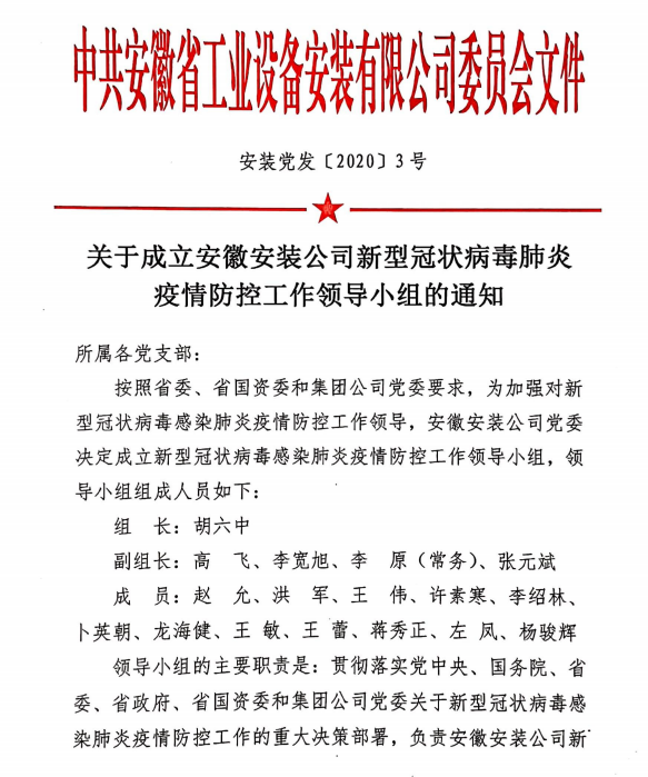 一是組織到位。1月26日,安徽安裝公司下發(fā)《關(guān)于成立新型冠狀病毒感染肺炎疫情防控工作領(lǐng)導(dǎo)小組的通知》,負(fù)責(zé)貫徹落實(shí)上級(jí)關(guān)于新型冠狀病毒感染肺炎疫情防控工作的重大決策部署,負(fù)責(zé)安徽安裝公司新型冠狀病毒感染肺炎疫情防控工作的領(lǐng)導(dǎo),研究解決安徽安裝公司疫情防控中的重大問(wèn)題,統(tǒng)籌組織防控處置。