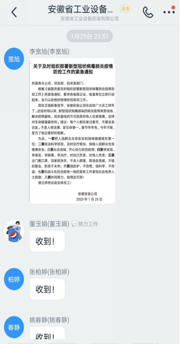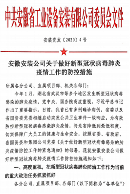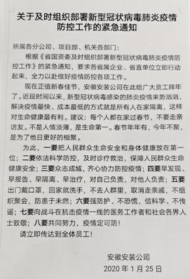 二是部署到位。疫情防控工作開(kāi)展后,1月25日(大年初一)安徽安裝公司發(fā)出防控疫情工作的緊急通知,1月27日制定肺炎疫情防控措施,對(duì)疫情防控工作進(jìn)行細(xì)化安排,周密部署。要求各分公司、直屬項(xiàng)目部、各部門要以對(duì)職工群眾生命安全高度負(fù)責(zé)的態(tài)度,精準(zhǔn)施策,堅(jiān)決遏制疫情在安徽安裝公司輸入、蔓延,鼓勵(lì)職工戴口罩、勤洗手、多通風(fēng)、少走動(dòng)、常消毒。