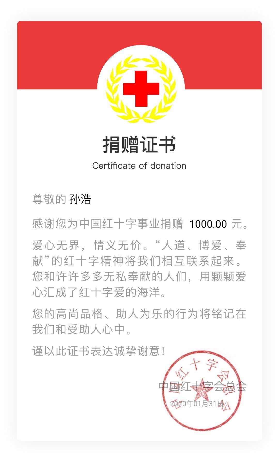 自新型冠狀病毒引發(fā)的肺炎疫情從湖北武漢爆發(fā)以來,始終牽動著眾人的心,更有不少愛心人士主動奉獻愛心。1月31日,孫浩一家三口懷著對武漢疫區(qū)同胞深深的愛,向中國紅十字會捐款抗擊疫情,以表達對武漢疫區(qū)人民的關(guān)愛。