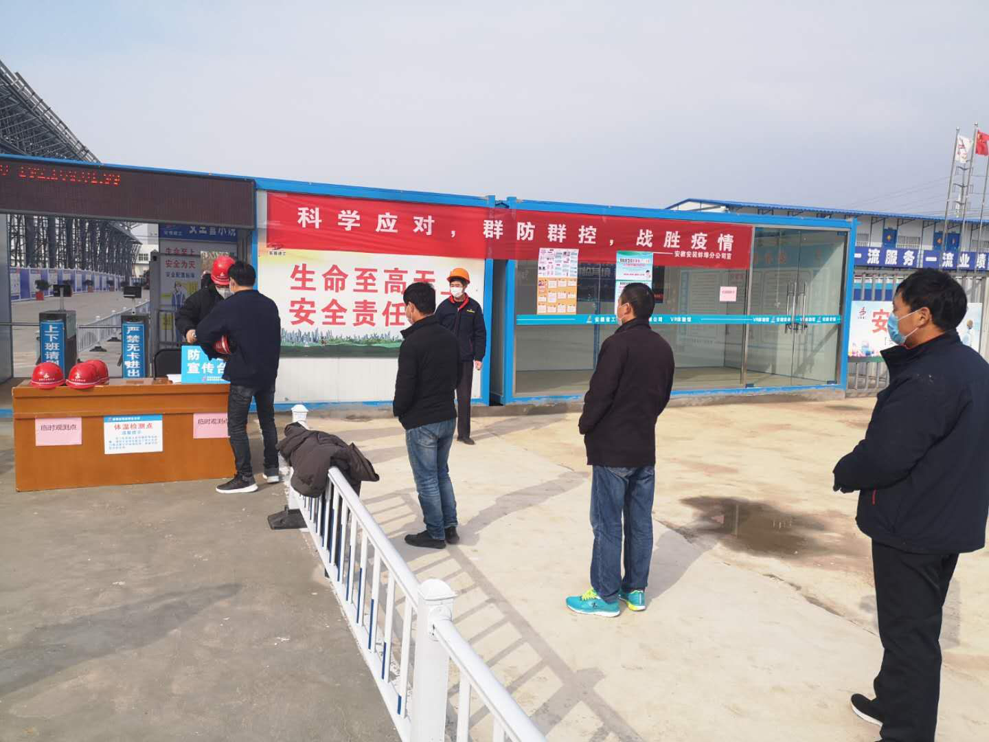 為確保項(xiàng)目順利復(fù)工,同時(shí)保障員工身體健康,項(xiàng)目部在復(fù)工前期提前配備了充足的防疫消殺物資,并與2月23日上午召開復(fù)工復(fù)產(chǎn)工作會(huì)。會(huì)上傳達(dá)學(xué)習(xí)了蚌埠市政府和公司關(guān)于疫情防控和復(fù)工復(fù)產(chǎn)相關(guān)文件精神,按照“一責(zé)兩案、五有”工作要求,制定了項(xiàng)目部疫情防控預(yù)案和工作方案,在施工現(xiàn)場配備了防疫人員和必要的醫(yī)護(hù)用品,設(shè)立了疫情監(jiān)測點(diǎn)和檢測隔離點(diǎn)。為保障工人安全上崗,項(xiàng)目部對所有進(jìn)場人員進(jìn)行嚴(yán)格摸排登記造冊,采取封閉式管理。同時(shí),堅(jiān)持每天兩次對辦公區(qū)、宿舍、食堂、廁所等公共區(qū)域全面消毒,要求各辦公室保持持續(xù)通風(fēng),減少人員聚集,項(xiàng)目食堂采取分餐制,避免交叉感染。此外,項(xiàng)目部還通過微信、QQ群、網(wǎng)上答題等方式積極宣傳疫情防控知識(shí),并在現(xiàn)場張貼疫情防控宣傳標(biāo)語和條幅,發(fā)放《安徽安裝公司關(guān)于新型冠狀病毒肺炎疫情防控工作宣傳手冊》,提高大家自我保護(hù)意識(shí)。