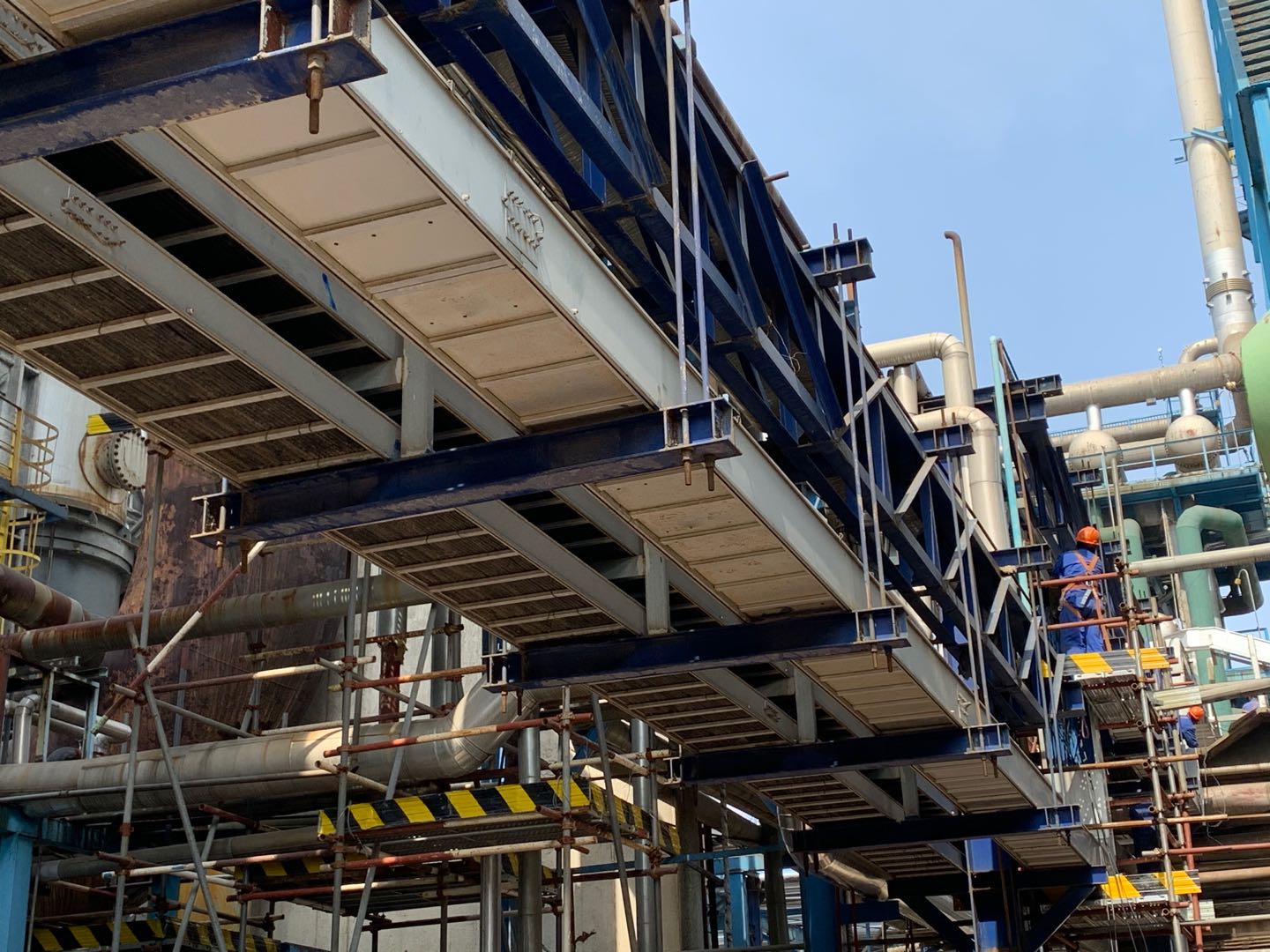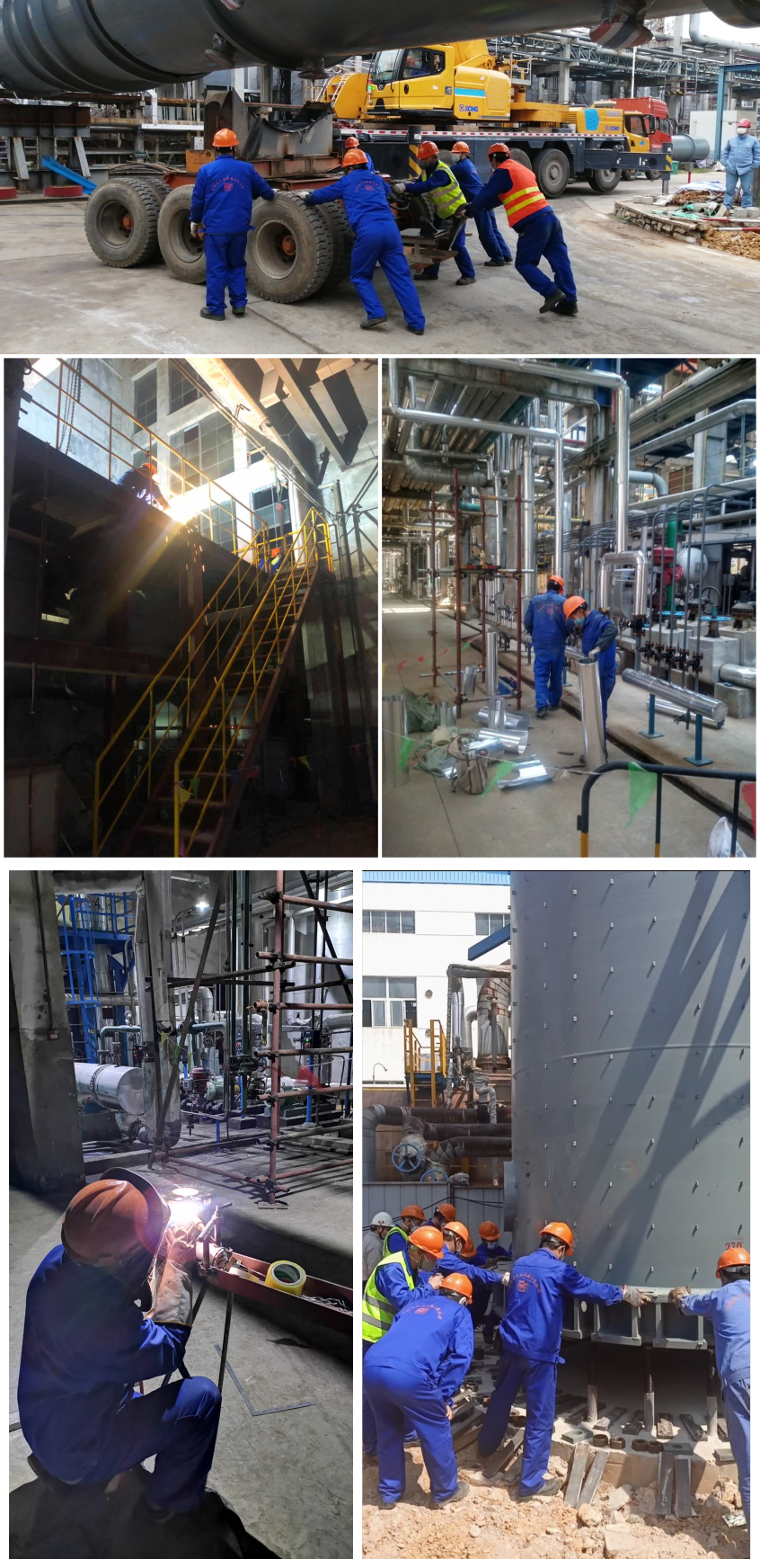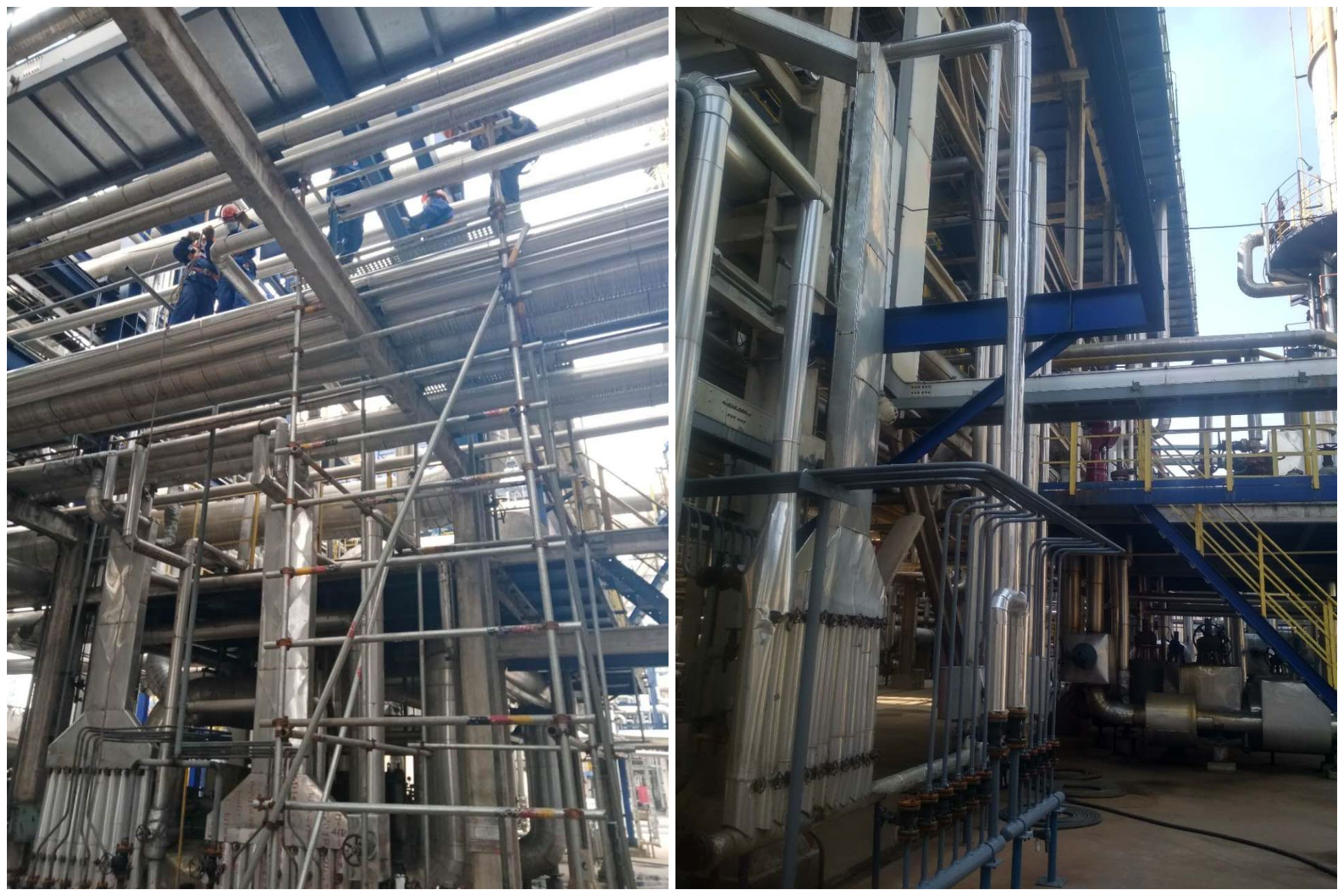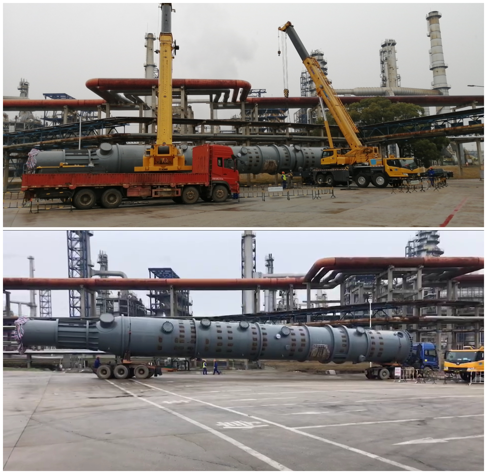 “Ⅰ、Ⅱ硫磺回收裝置增設(shè)煙氣后堿洗流程項(xiàng)目”是能使煙氣SO2排放濃度從原先的50mg/m3下降至≤10mg/m3的環(huán)保工程。但該項(xiàng)工程僅一個(gè)脫硫塔下段就高達(dá)33米,重達(dá)58噸,體積十分龐大,而現(xiàn)場(chǎng)存在作業(yè)場(chǎng)地狹小,固有障礙物多、吊重荷載大等諸多問(wèn)題,無(wú)法將設(shè)備一次性運(yùn)至施工現(xiàn)場(chǎng)并進(jìn)行下段焊接梯子、平臺(tái)等附塔“穿衣戴帽”作業(yè)。對(duì)此,項(xiàng)目部多次優(yōu)化倒運(yùn)方案,提前合理部署,采用額定荷載分別為220噸和90噸的汽車(chē)吊實(shí)施雙機(jī)抬吊作業(yè)和專為公路橋梁設(shè)計(jì)使用的炮車(chē)運(yùn)輸,從而順利完成了倒運(yùn)工作。同時(shí),為爭(zhēng)取時(shí)間,安排班組實(shí)行夜間倒班制,管理人員輪班制,為接下來(lái)的脫硫塔“穿衣戴帽”和上下段空中組對(duì)焊接作業(yè)爭(zhēng)取了寶貴時(shí)間。