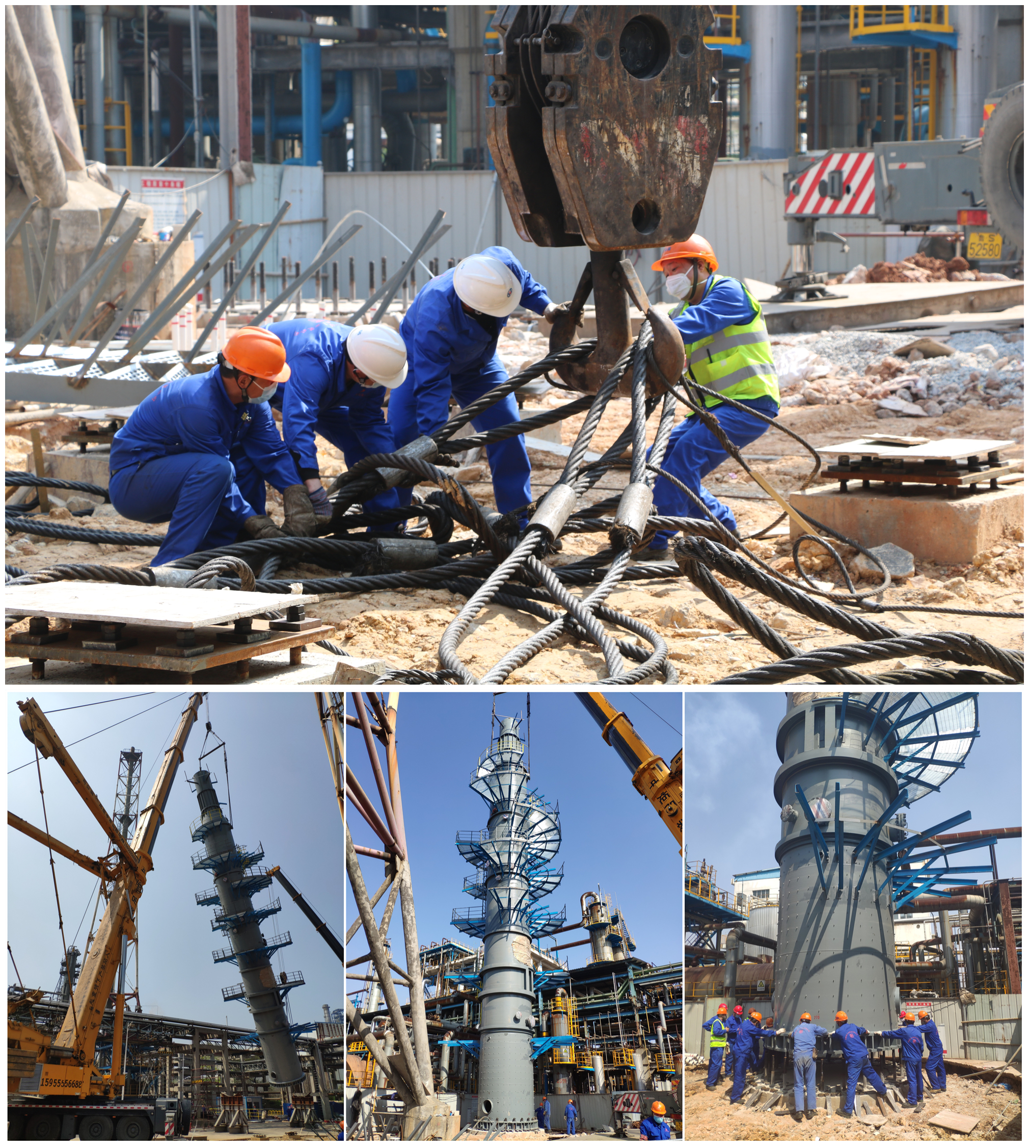 此次吊裝的脫硫塔下段,高33米,直徑3.043米,塔體及設(shè)備平臺(tái)、爬梯等附塔物總重達(dá)76噸。由于作業(yè)場地面積有限、周邊構(gòu)筑物障礙多、吊重荷載大等諸多困難,吊裝任務(wù)異常艱巨。對(duì)此,安慶分公司領(lǐng)導(dǎo)高度重視,提前謀劃,從地基處理、吊車站位、吊點(diǎn)選擇等角度,實(shí)地考察,制定針對(duì)性專項(xiàng)吊裝方案及防護(hù)措施,按照方案要求采用額定荷載500噸的汽車吊主吊,220噸的汽車吊溜索,實(shí)施雙機(jī)配合吊裝作業(yè)。吊裝前期,還特別邀請(qǐng)公司副總經(jīng)理高飛和相關(guān)部門負(fù)責(zé)人親臨項(xiàng)目現(xiàn)場進(jìn)行指導(dǎo)。