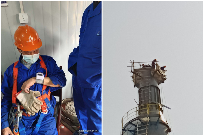 面對Ⅲ級高空作業(yè),項目部從對登塔作業(yè)人員的篩選開始就不敢有半點大意,除了項目技術負責人、安全負責人分別進行技術和安全交底外,還仔細檢查了登塔人員體檢報告,并在登塔作業(yè)前逐一對其進行血壓測量,確保高處作業(yè)人員身體狀況穩(wěn)定。同時,配備對講機,保障上下作業(yè)人員密切配合,順利吊裝,還要對作業(yè)平臺和周圍區(qū)域滿鋪防火布,設置接火盆,避免塔體下方易燃易爆風險,以此杜微慎防,確保萬無一失。11時28分,脫硫塔上段吊裝正式開始。在場人員個個屏息凝神,目光隨著脫硫塔一起移動,思緒跟著脫硫塔一起飆高,“慢慢的...升一點...往西偏一點點...好!停!...降,慢一點...降降降,好!”終于完成上段吊裝環(huán)節(jié)作業(yè),所有人懸著的心都放下來了,但是任務還沒徹底完成,接下來就是更重要的對口、焊接環(huán)節(jié)。由于要進入塔內(nèi)進行對口焊接,為了保障作業(yè)人員的生命安全,配備氣體檢測儀,以測量塔內(nèi)氧氣濃度是否正常,無硫化氫和可燃性氣體是否超標。