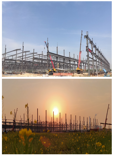 為進(jìn)一步調(diào)動參建人員的積極性和創(chuàng)造性,分公司組織開展項目“大干90天”勞動競賽,有效形成了一片“比、學(xué)、趕、幫、超”的火熱生產(chǎn)局面。盡管3月底持續(xù)陰雨天氣,但絲毫沒有影響到月施工進(jìn)度,2#車間整體框架已全部按時間節(jié)點圓滿完成。目前,1#車間安裝正在高速推進(jìn)。
