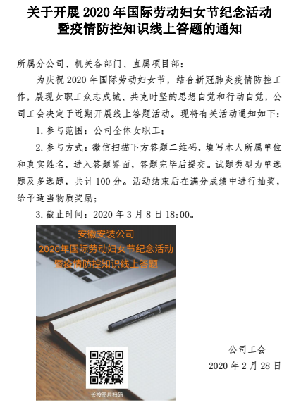 鑒于當(dāng)前新冠肺炎疫情防控特殊時期,本著不聚集、少聚集的原則,安徽安裝公司工會組織全公司八十多名女職工參加了疫情防控和《婦女權(quán)益保障法》等知識的學(xué)習(xí),利用微信平臺開展了線上答題活動,活動一推出,廣大女職工立即響應(yīng),熱情高漲,對于不太清楚的問題,主動查閱相關(guān)資料,與身邊的同事討論,對模棱兩可的問題,仔細(xì)斟酌精確作答。通過此次答題活動,全公司范圍內(nèi)再一次掀起宣傳疫情防控常識的熱潮,推動公司疫情防控工作的開展,也進一步普及了新時期下女職工的合法權(quán)益。答題活動結(jié)束后,對優(yōu)秀成績給予獎勵。
