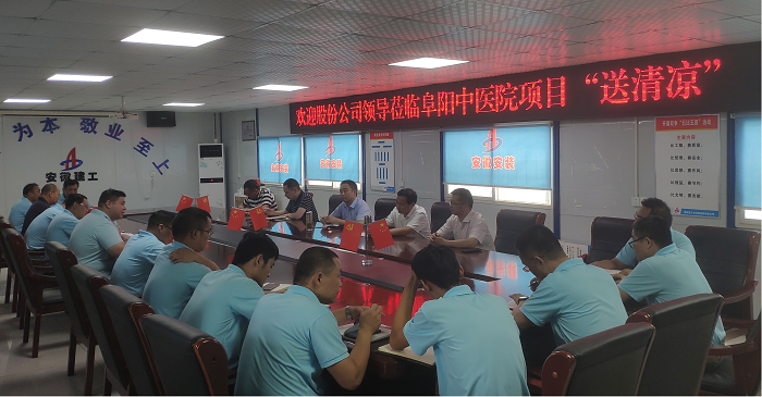 7月16日上午,股份公司副總經(jīng)理黃代、證券事務(wù)部副部長盛道勝赴安徽安裝公司阜陽潁東區(qū)中醫(yī)院建設(shè)PPP項(xiàng)目“送清涼”并調(diào)研指導(dǎo)工作。安徽安裝黨委書記、董事長胡六中,副總經(jīng)理高飛參加調(diào)研。