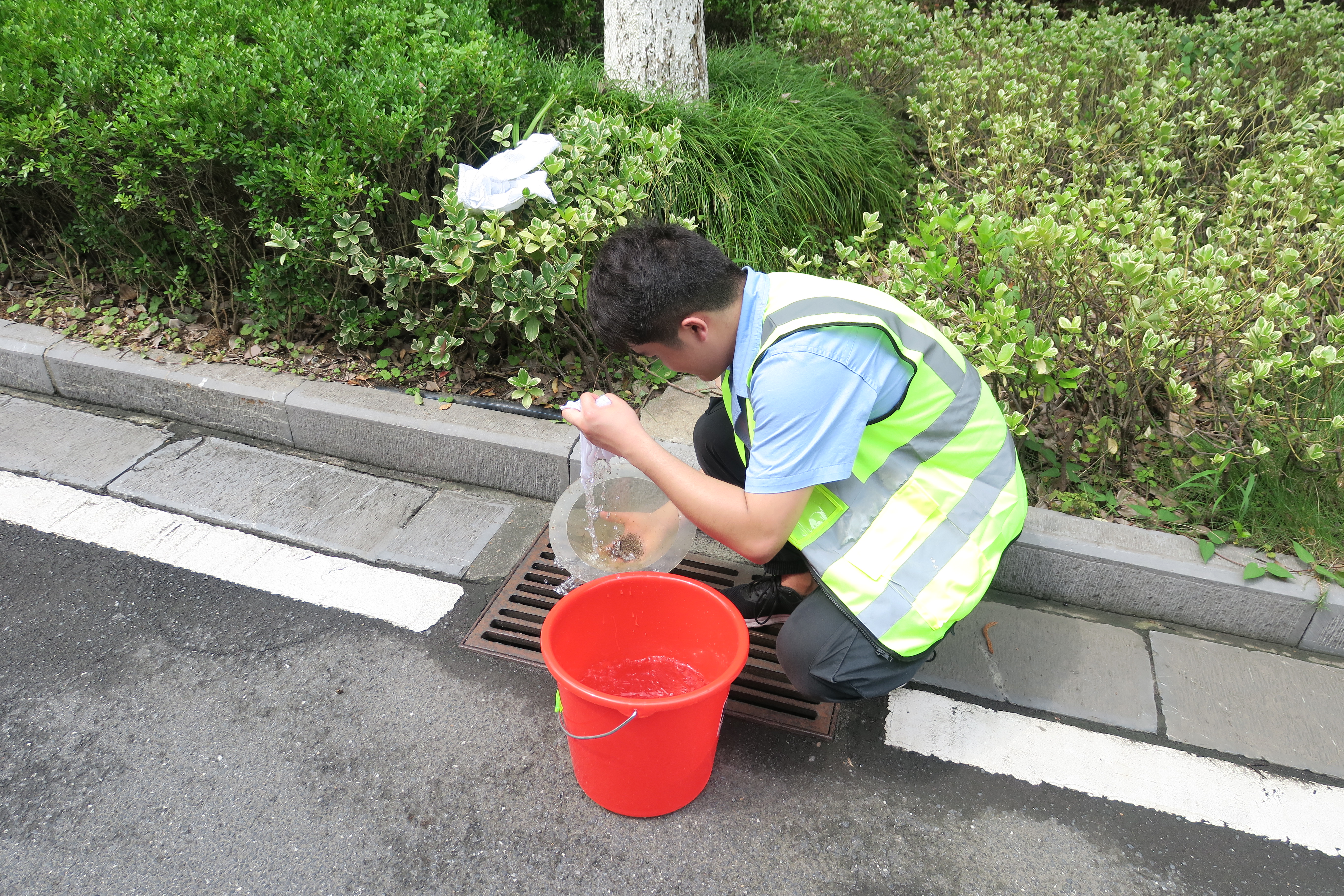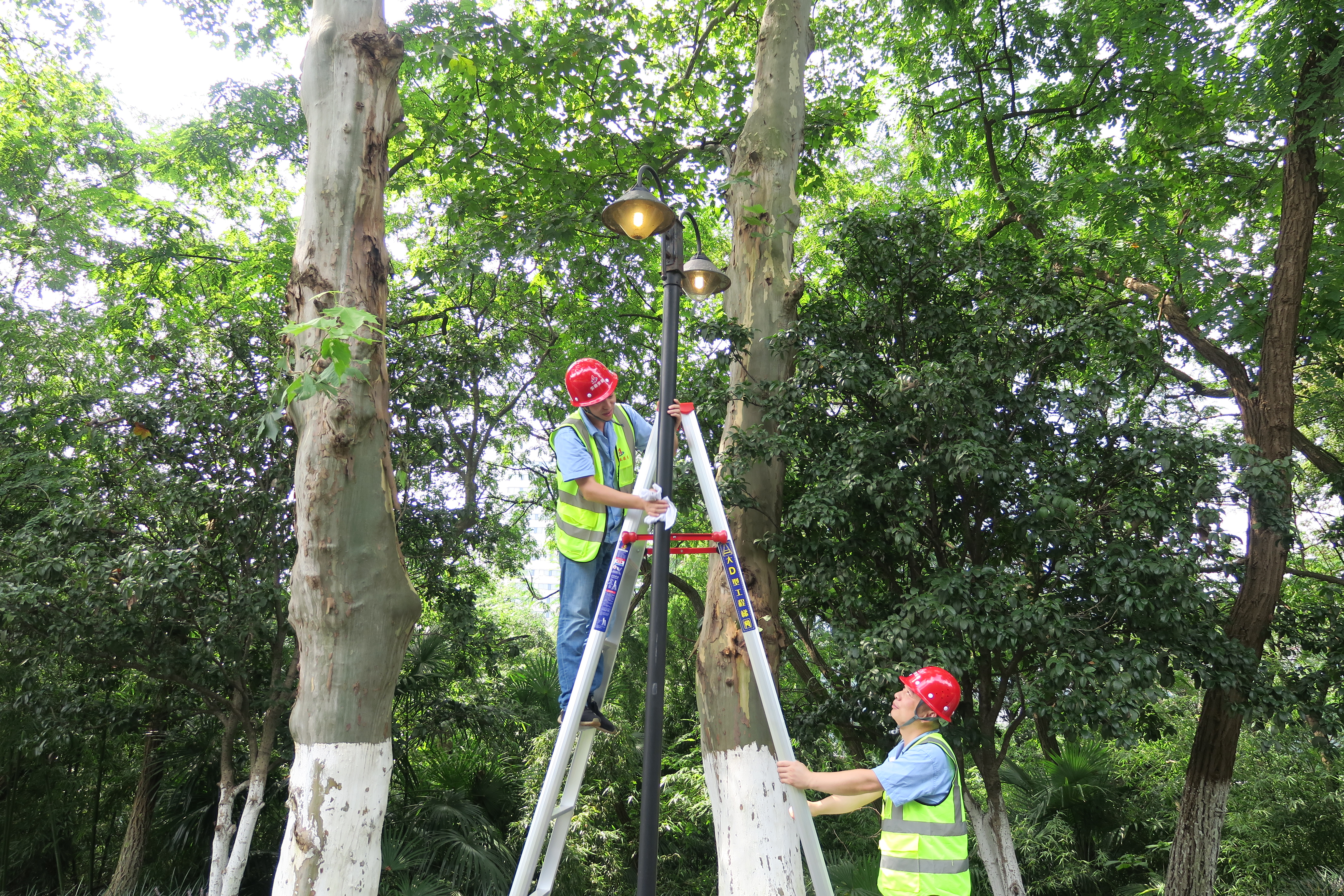 到達(dá)項(xiàng)目現(xiàn)場(chǎng)后,大家迅速分組,每組都由一名有施工經(jīng)驗(yàn)的老員工帶領(lǐng)。在項(xiàng)目部負(fù)責(zé)人的統(tǒng)一指揮下,大家?guī)Ш冒踩o(hù)具和工作用具,進(jìn)入施工現(xiàn)場(chǎng)開(kāi)始了緊張的勞動(dòng)。此時(shí)室外氣溫達(dá)到38攝氏度,但大家絲毫不懈怠、不畏懼,頭頂烈日為路燈刷油漆、洗燈罩、換燈泡,竭心盡力的完成各項(xiàng)工作。