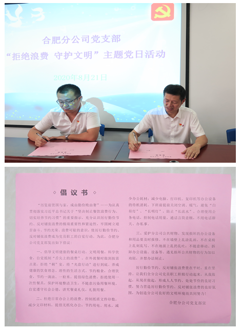 為認(rèn)真貫徹落實(shí)習(xí)近平總書記關(guān)于堅(jiān)決制止餐飲浪費(fèi)行為、切實(shí)培養(yǎng)節(jié)約習(xí)慣的重要指示精神,牢固樹立艱苦奮斗、節(jié)約光榮、浪費(fèi)可恥的意識(shí)。8月20日下午,合肥分公司黨支部在職工之家組織開展了“拒絕浪費(fèi) 守護(hù)文明”主題黨日活動(dòng)。分公司黨員職工近60人踴躍參加。