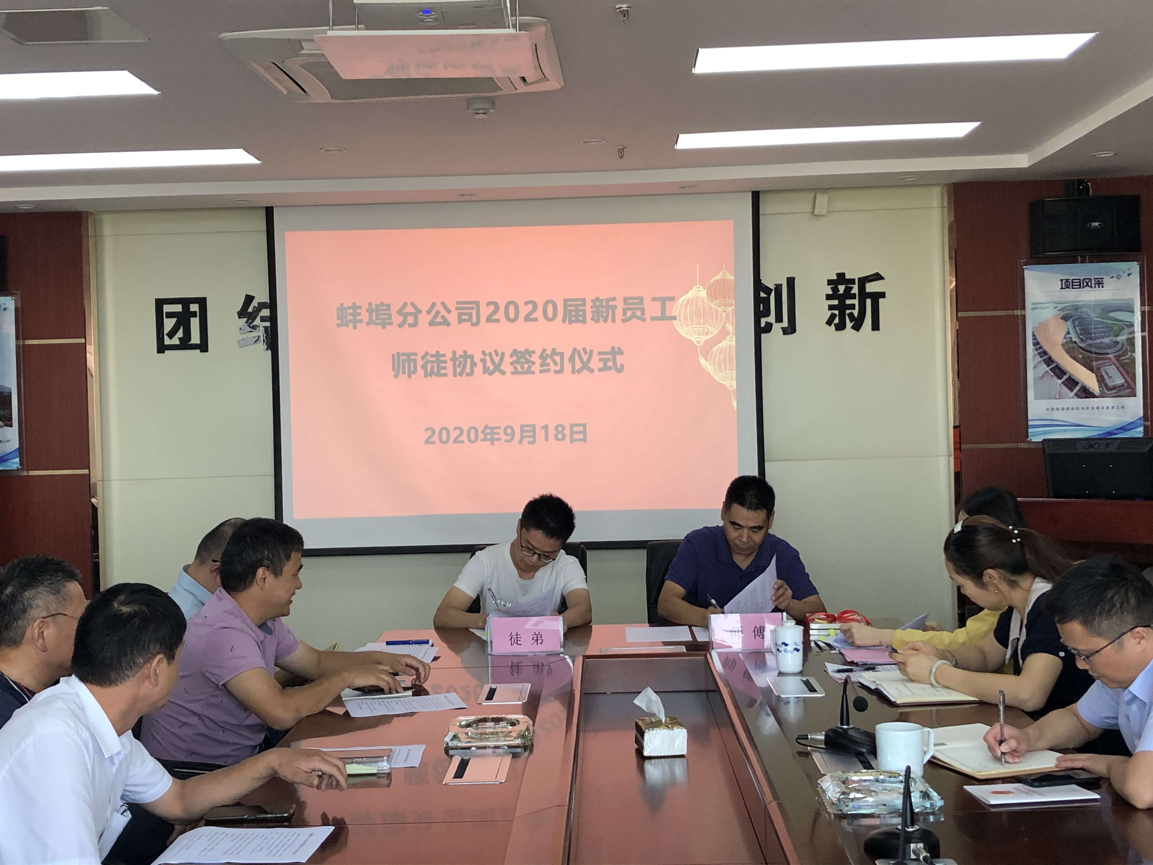為了幫助新入職大學(xué)生盡快適應(yīng)企業(yè),熟悉工作,勝任崗位,2020年9月18日上午蚌埠分公司黨支部舉行了“2020屆新員工師徒結(jié)對(duì)”簽約儀式。分公司班子成員、部門負(fù)責(zé)人、項(xiàng)目經(jīng)理、師傅及2020屆新入職大學(xué)生參加了此次會(huì)議。