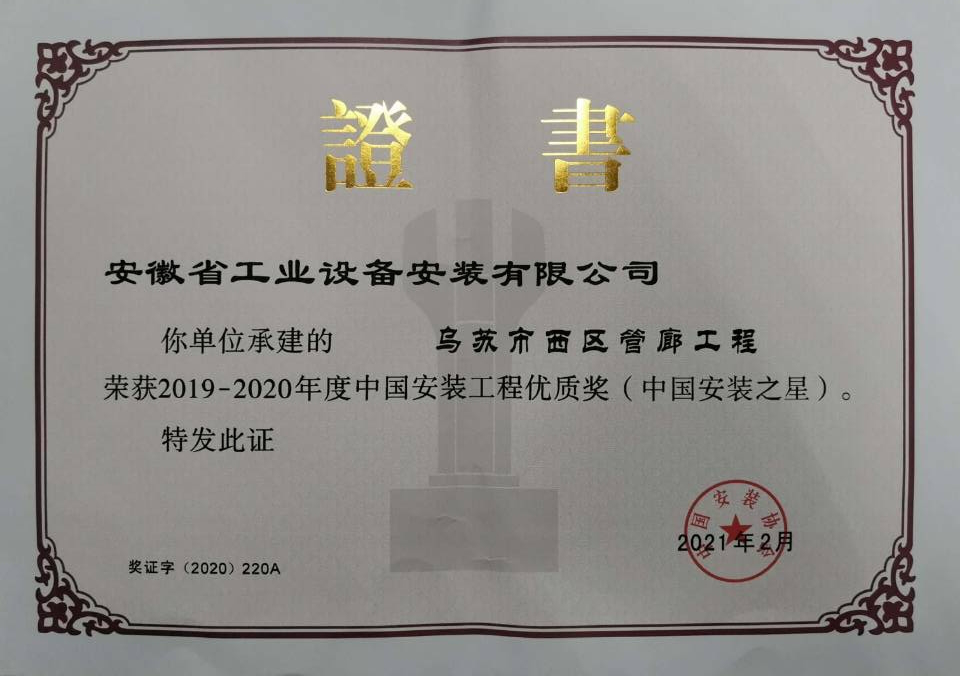 大會頒發(fā)了2019-2020年度中國安裝工程優(yōu)質(zhì)獎(中國安裝之星)獲獎工程。我公司承建的烏蘇市西區(qū)管廊工程榮獲“中國安裝之星”中國安裝工程優(yōu)質(zhì)獎。胡六中董事長被授予 “中國安裝工程優(yōu)質(zhì)獎工程企業(yè)領(lǐng)導(dǎo)人”特別榮譽(yù),康永軍經(jīng)理被授予“中國安裝工程優(yōu)質(zhì)獎工程項(xiàng)目經(jīng)理”特別榮譽(yù)。