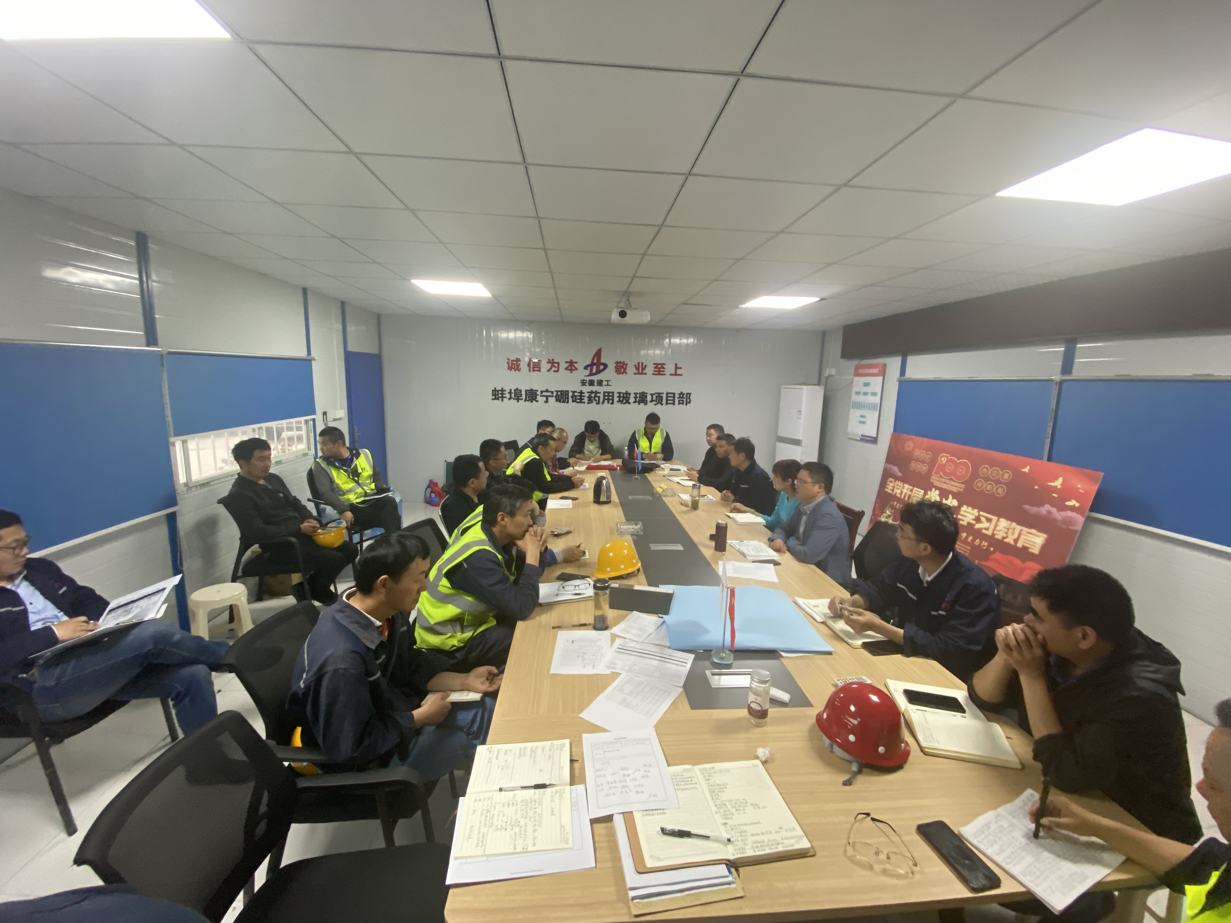 5月18日,雖然已是晚間八點多,但是位于蚌埠市中環(huán)線南、中糧大道以西的康寧藥用玻璃管項目現(xiàn)場到處是一片繁忙的景象。項目部會議室內(nèi)燈火通明,全體參戰(zhàn)人員正在召開項目協(xié)調(diào)推進會,而在不遠處的施工現(xiàn)場,機器設(shè)備聲轟鳴,百十名施工人員在各自的崗位上緊張而有序地忙碌著。