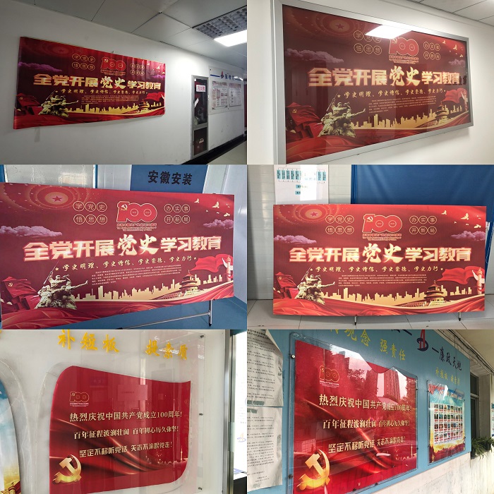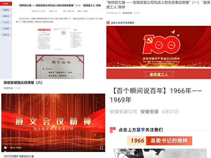 公司黨委第一時間編印專刊宣傳板報下發(fā)至所屬各單位和基層項目一線,用好企業(yè)網(wǎng)站、微信公眾號、電子屏、宣傳欄和所屬各單位、各項目部所有宣傳陣地,在公司網(wǎng)站、微信公眾號先后開設(shè)“百個瞬間說百年”“黨史學(xué)習(xí)教育專欄系列報道”“榜樣的力量——安徽安裝公司先進人物先進事跡展播”“記錄奮進力量—安徽安裝公司基層一線事跡展播”等專欄進行專題宣傳,大力營造“學(xué)習(xí)黨史有熱情,干事創(chuàng)業(yè)有激情”的良好氛圍,合肥分公司黨支部舉辦黨史學(xué)習(xí)教育主題攝影大賽,努力營造悟初心、守初心、踐初心的強大聲勢。