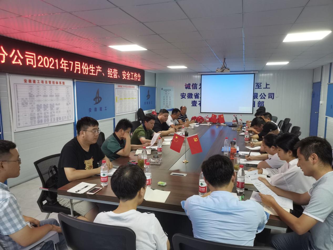 7月31日,房建(裝飾)分公司在定遠(yuǎn)壹石通化學(xué)科技廠房項(xiàng)目部召開7月生產(chǎn)、安全、經(jīng)營(yíng)工作會(huì)議,分公司領(lǐng)導(dǎo)班子成員、所屬各項(xiàng)目班子成員、分公司機(jī)關(guān)各部門負(fù)責(zé)人以及工程部全體成員參加會(huì)議,會(huì)議由分公司副經(jīng)理徐明東主持。