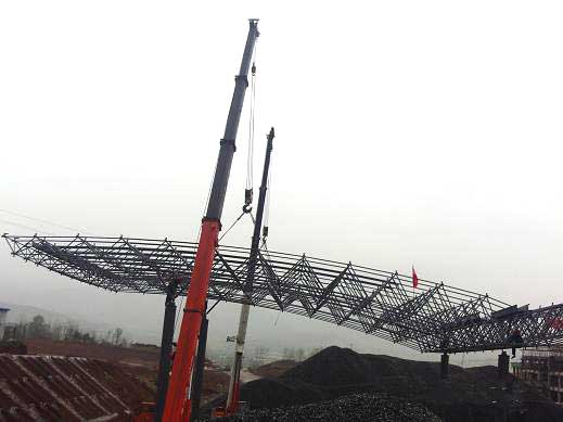 當日上午9時整,隨著吊裝負責(zé)人一聲令下,一臺75T汽車吊作為主吊吊起鋼網(wǎng)架一端,兩臺25T汽車吊做輔吊吊起鋼網(wǎng)架另一端,50噸的大鋼網(wǎng)架徐徐升起,經(jīng)過調(diào)整、就位、固定,鋼網(wǎng)架終于穩(wěn)穩(wěn)地落在高高的鋼柱上,整個吊裝過程歷時不到1小時就安全完成。吊裝的科學(xué)合理安排、進展的有序組織得到業(yè)主和監(jiān)理的贊許。