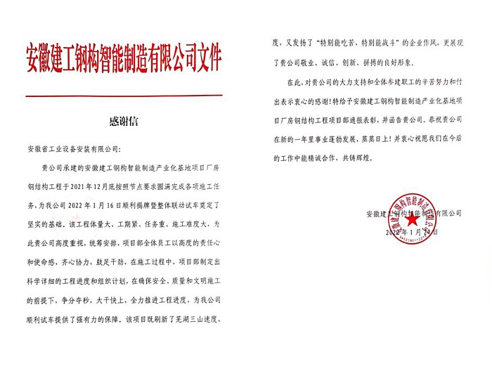 信中表示,安徽建工鋼構(gòu)智能制造有限公司廠房鋼結(jié)構(gòu)工程自開工以來,科學(xué)制定施工生產(chǎn)計劃,項目部全體員工以高度的責(zé)任心、使命感,齊心協(xié)力,鼓足干勁,在確保安全、質(zhì)量和文明施工的前提下,爭分奪秒,大干快上,全力推進工程進度。最終在2021年12月底前按照節(jié)點要求圓滿完成各項施工任務(wù),為業(yè)主單位順利揭牌暨整體聯(lián)動試車成功提供了強有力的保障,展現(xiàn)了敬業(yè)、誠信、創(chuàng)新、拼搏的良好形象。