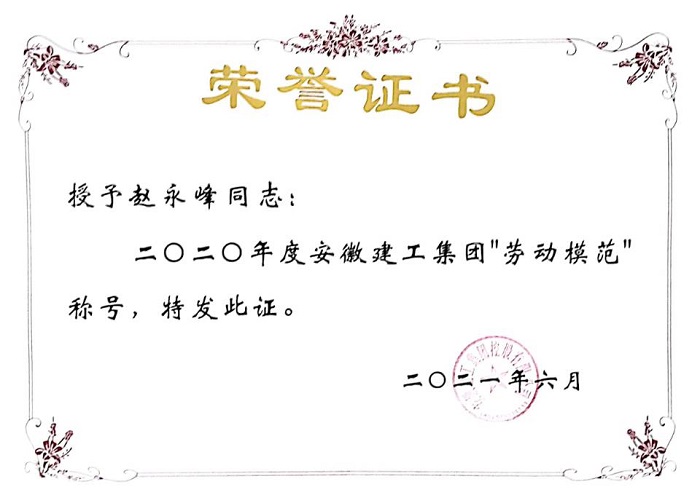 2019年3月,根據(jù)安徽安裝公司拓展市場、加快發(fā)展的工作要求,趙永峰勇挑重擔(dān),擔(dān)負起了合肥分公司“開拓市場一片天”的重任,團結(jié)帶領(lǐng)分公司班子成員和全體員工立足新起點、整裝再出發(fā),努力為實現(xiàn)分公司新一輪大發(fā)展而不懈奮斗,取得的可喜成績得到了領(lǐng)導(dǎo)和員工們的一致認可和稱贊。受到安徽建工集團及安徽省工業(yè)設(shè)備安裝有限公司的表彰,在2021年7月1日-2日召開的安徽建工集團控股有限公司二屆一次職工代表大會暨“七一”表彰會上,趙永峰同志作為集團勞動模范代表光榮的上臺授獎。