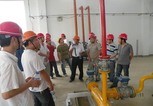 觀摩開始前,戴書記及包處長進行動員講話,要求大學(xué)生一定要認真聽講,珍惜這次觀摩學(xué)習(xí)的機會。項目部經(jīng)理趙永峰詳細介紹了工程概況及項目部對本工程的現(xiàn)場管理和安全生產(chǎn)、文明施工管理情況。業(yè)主周工對合成車間一、合成車間二的管道走向及工藝流程一一向大家講解,并對公用部分的設(shè)備功能逐一進行了詳細的介紹。項目部鄭圣軍和徐松同志分別介紹了工藝管道、設(shè)備安裝和電氣安裝的相關(guān)流程。講解人講解細致,大學(xué)生們聽得認真。