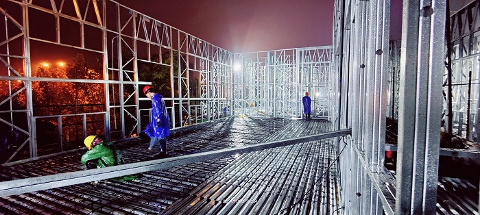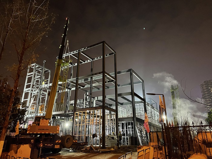 自11月初接到項(xiàng)目任務(wù)以來,面對一個(gè)月完成三層結(jié)構(gòu)方艙醫(yī)院主體機(jī)構(gòu)、內(nèi)部安裝、室外裝飾的極限工期,安徽安裝公司高度重視、精心組織、科學(xué)安排、迎難而上,全力以赴加快工程建設(shè),期間,公司領(lǐng)導(dǎo)多次前往項(xiàng)目現(xiàn)場幫助協(xié)調(diào)解決工程施工中的難點(diǎn)、困難,為項(xiàng)目人員鼓勁加油;公司相關(guān)部門負(fù)責(zé)人駐扎項(xiàng)目一線,指導(dǎo)協(xié)調(diào)內(nèi)部流程、現(xiàn)場施工、外部對接、質(zhì)量安全等一應(yīng)事務(wù);分公司第一時(shí)間組織精干力量進(jìn)入項(xiàng)目現(xiàn)場,梳理現(xiàn)場情況,核對圖紙清單,進(jìn)行施工準(zhǔn)備。從公司領(lǐng)導(dǎo)到項(xiàng)目一線,安徽安裝公司自上而下以高度的使命感和責(zé)任感,投入到緊張的工程建設(shè)中去。項(xiàng)目管理人員披星戴月,從早上到夜間駐守在項(xiàng)目一線,每日召開工程會議,討論施工工作進(jìn)展,制定下一步工作計(jì)劃,安排交叉作業(yè)工序。為保障夜間施工安全,項(xiàng)目部安排兩名安全員輪流值守項(xiàng)目現(xiàn)場,夜間在項(xiàng)目現(xiàn)場不斷巡查確保施工安全、高效開展。