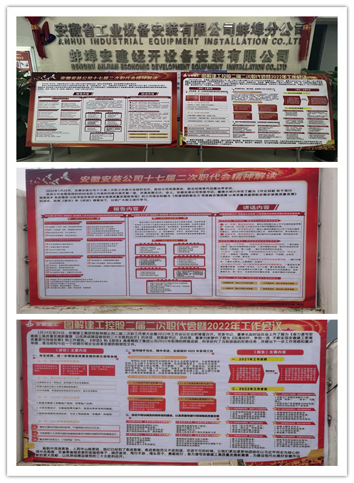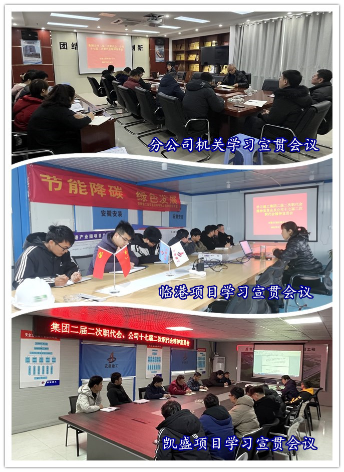 2月10日—11日,在分公司機關(guān)和各在建項目一線召開兩級職代會精神專題宣貫會。會議由分公司黨支部書記程茂麗主持。會上,程茂麗首先傳達了集團公司黨委書記、董事長趙時運在集團二屆二次職代會暨2022年度工作會議作的題為《奮力譜寫安徽建工高質(zhì)量發(fā)展新篇章 以優(yōu)異成績迎接黨的二十大勝利召開》的講話和集團黨委副書記、總經(jīng)理、董事劉家靜作的題為《拉高標(biāo)桿、爭創(chuàng)一流 不斷實現(xiàn)安徽建工更高質(zhì)量更可持續(xù)發(fā)展》的工作報告;隨后又帶領(lǐng)大家深入解讀了公司黨委書記、董事長胡六中在公司十七屆二次職代會上所作的《守正創(chuàng)新 實干篤行 強基固本 競進提質(zhì) 以趕考姿態(tài)答好安徽安裝高質(zhì)量發(fā)展新答卷》的報告及《黨建領(lǐng)航聚合力 深度融合強保障 以高質(zhì)量黨建領(lǐng)航安徽安裝高質(zhì)量發(fā)展》的講話。