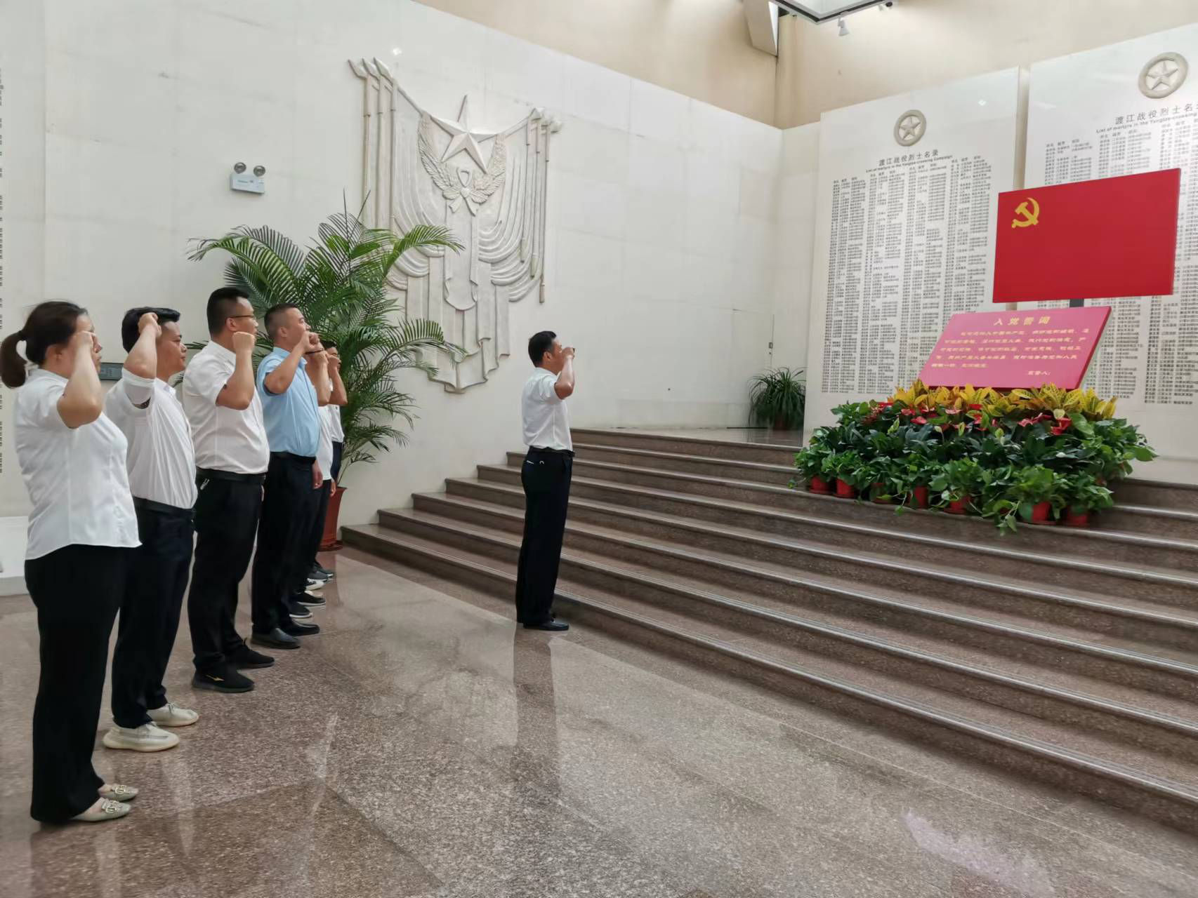 “我志愿加入中國共產(chǎn)黨,擁護黨的綱領(lǐng),遵守黨的章程,履行黨員義務(wù)……”。在渡江戰(zhàn)役紀念館,面對面對鮮紅的黨旗,在分公司黨支部書記胡迎東的帶領(lǐng)下,全體黨員高舉右手,重溫了入黨誓詞再次作出為共產(chǎn)主義奮斗終身的莊重承諾。
