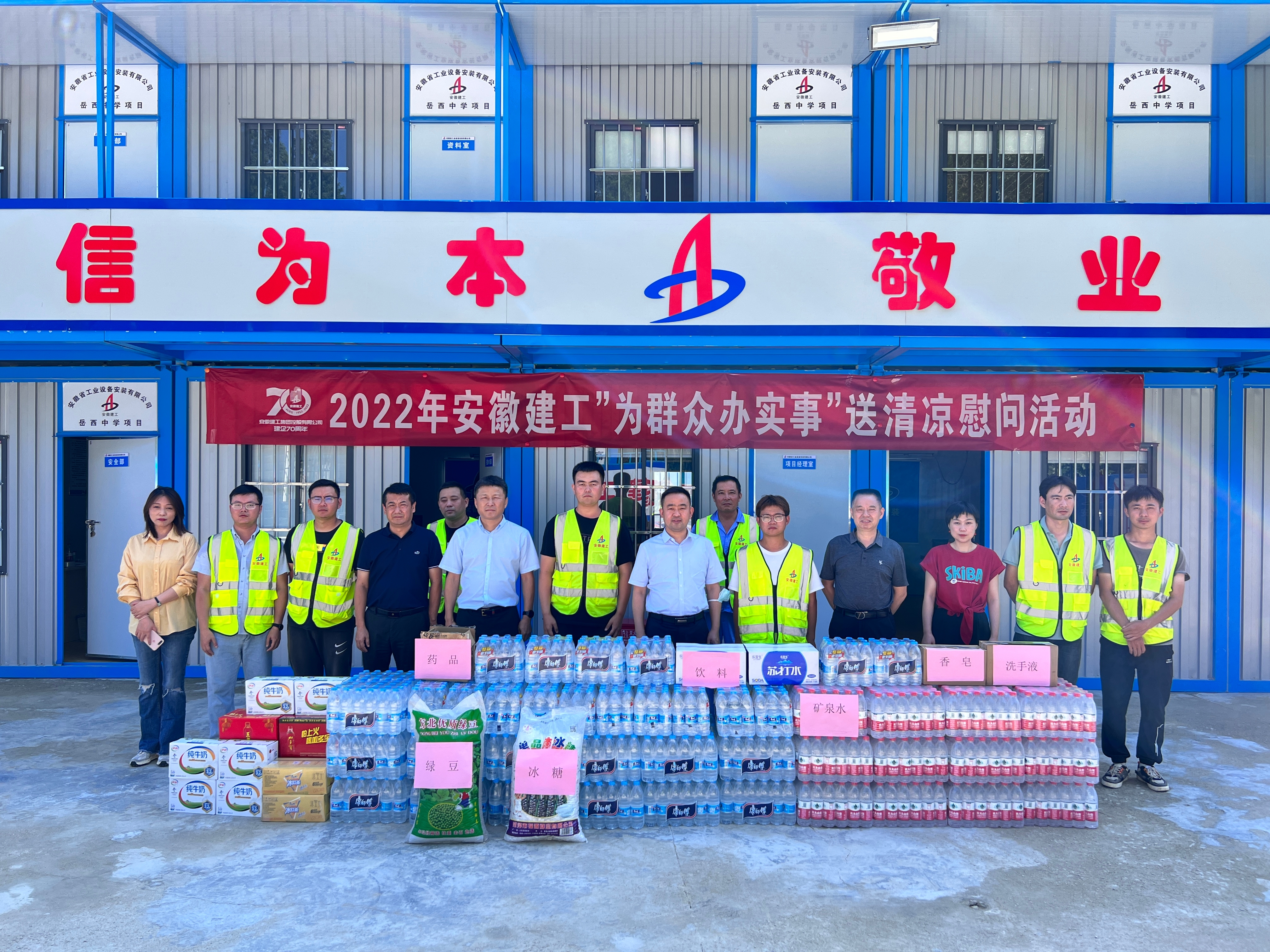 7月15日,建工股份黨委委員、副總經(jīng)理黃代赴安徽安裝岳西中學(xué)建設(shè)項(xiàng)目宣貫建工控股第一次黨代會(huì)精神暨開展“為群眾辦實(shí)事”送清涼慰問(wèn)活動(dòng),安徽安裝公司黨委書記、董事長(zhǎng)胡六中參加慰問(wèn)。
