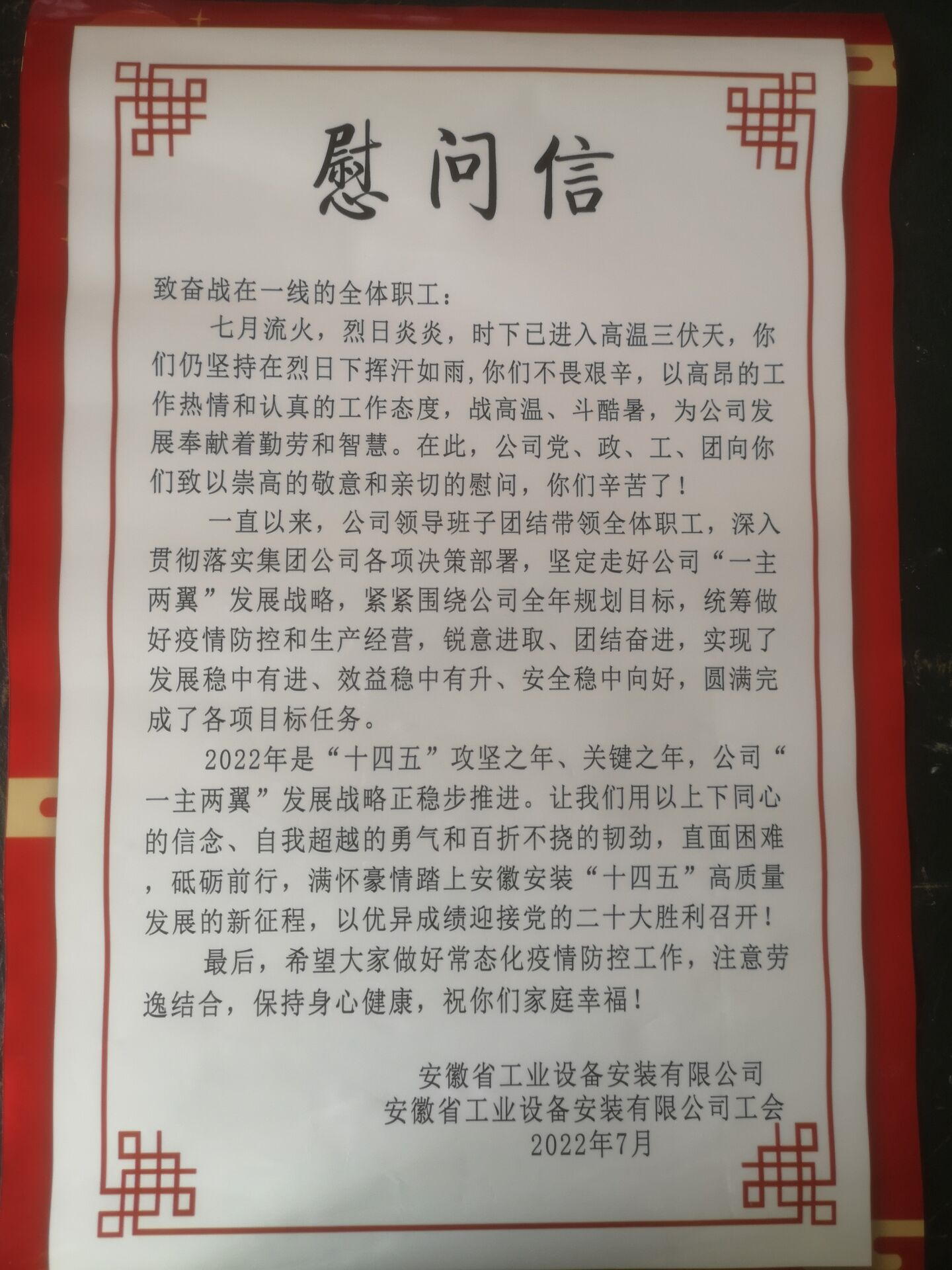 隨后在項(xiàng)目部會(huì)議室,李楊對(duì)集團(tuán)和公司兩級(jí)“十四五”發(fā)展戰(zhàn)略與規(guī)劃進(jìn)行了宣貫解讀。隨后代表公司向奮戰(zhàn)在一線的項(xiàng)目部員工表示慰問(wèn)和感謝,送來(lái)了防暑降溫慰問(wèn)品和慰問(wèn)信,并與項(xiàng)目部員工進(jìn)行了親切交談。在談話中,李楊鼓勵(lì)項(xiàng)目部青年員工和新大學(xué)生要樹(shù)立好正確的世界觀、人生觀和價(jià)值觀,在工作中找準(zhǔn)定位,不斷提升業(yè)務(wù)能力,將個(gè)人的進(jìn)步與企業(yè)的發(fā)展緊密地結(jié)合在一起,與企業(yè)共同成長(zhǎng)。