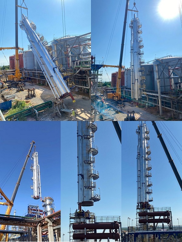 陣陣轟鳴聲中,汽提塔上段在兩臺500噸、160噸吊車的默契配合下緩緩升高,直至完全吊離鞍座。15時48分,汽提塔上段豎立,溜索摘除,由主吊車穩(wěn)步吊向汽提塔下段上方,對準(zhǔn)接口慢慢落下,工人師傅立即上前組對點(diǎn)口,16時12分點(diǎn)口完成。為爭取寶貴時間,項(xiàng)目部實(shí)行管理人員輪班制、班組夜間倒班制,通宵焊接作業(yè),于次日中午時分完成組對焊接。為保證組對質(zhì)量,剛焊接完的汽提塔上段還要被吊車“提拎著”靜置12小時以上。最終在8月7日7時48分,隨著主吊車緩緩摘鉤,安慶石化200噸/時污水汽提裝置項(xiàng)目重要節(jié)點(diǎn)——汽提塔上段空中組對完美收官,整個過程歷經(jīng)40個小時。
