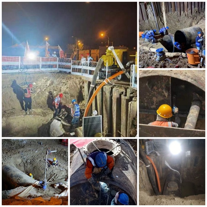 合肥四水廠(chǎng)新建的DN1800、DN1400分別為原水管和清水管兩條供水管線(xiàn)。DN1400清水管道之前已完成勾點(diǎn),這次需要對(duì)新建DN1800原水管道進(jìn)行停水勾點(diǎn)。停水勾點(diǎn)會(huì)直接影響到附近居民的生活用水,因此有嚴(yán)格的時(shí)間限制,要求項(xiàng)目部必須提前做好充分準(zhǔn)備,在規(guī)定的時(shí)段內(nèi),不間斷連續(xù)作業(yè),按時(shí)完成搶工任務(wù)。這也是對(duì)單位施工能力的重要考驗(yàn)。