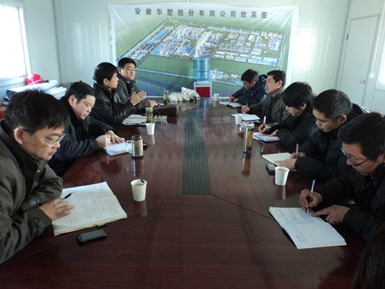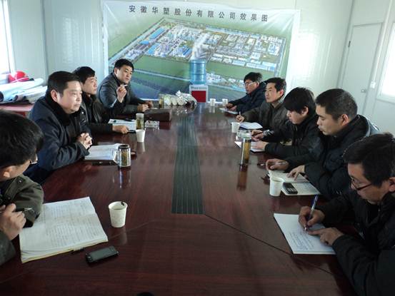 王總一行首先聽取了安徽華塑項目部關(guān)于質(zhì)量、安全文明、施工進(jìn)度、工作目標(biāo)和下一步工作計劃的匯報。王總一行對安徽華塑項目部在開工短短兩個月內(nèi)取得的成績給予充分肯定。王總特別指出,在工期緊、任務(wù)重、困難大的情況下,項目部一定要思想上重視,制定科學(xué)合理的方案,與施工各方進(jìn)行高效溝通,搶工期、保質(zhì)量、展風(fēng)采,為后續(xù)工程的承接創(chuàng)造有利條件。