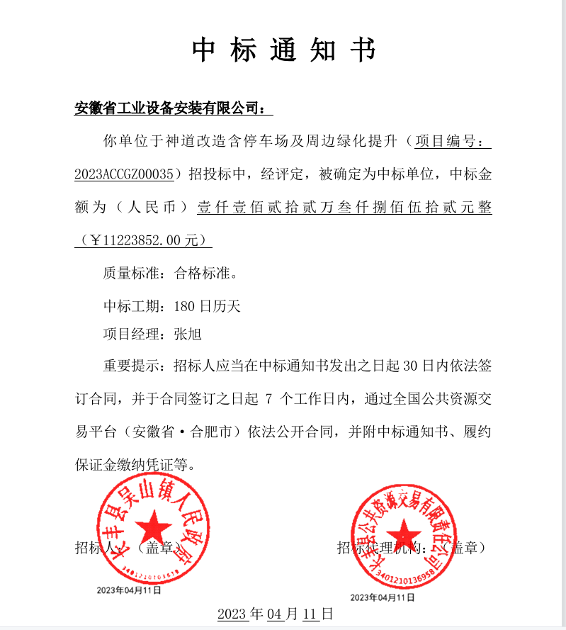4月11日,安徽安裝市政分公司在合肥市公共資源交易平臺(tái)上投標(biāo)長豐縣吳山鎮(zhèn)神道改造含停車場及周邊綠化提升項(xiàng)目并一舉中標(biāo),中標(biāo)金額1122.38萬元。這次公招中標(biāo)是分公司繼2022年8月12日廬江立人路項(xiàng)目中標(biāo)后第二次在合肥市公招市場中標(biāo)的市政類項(xiàng)目。