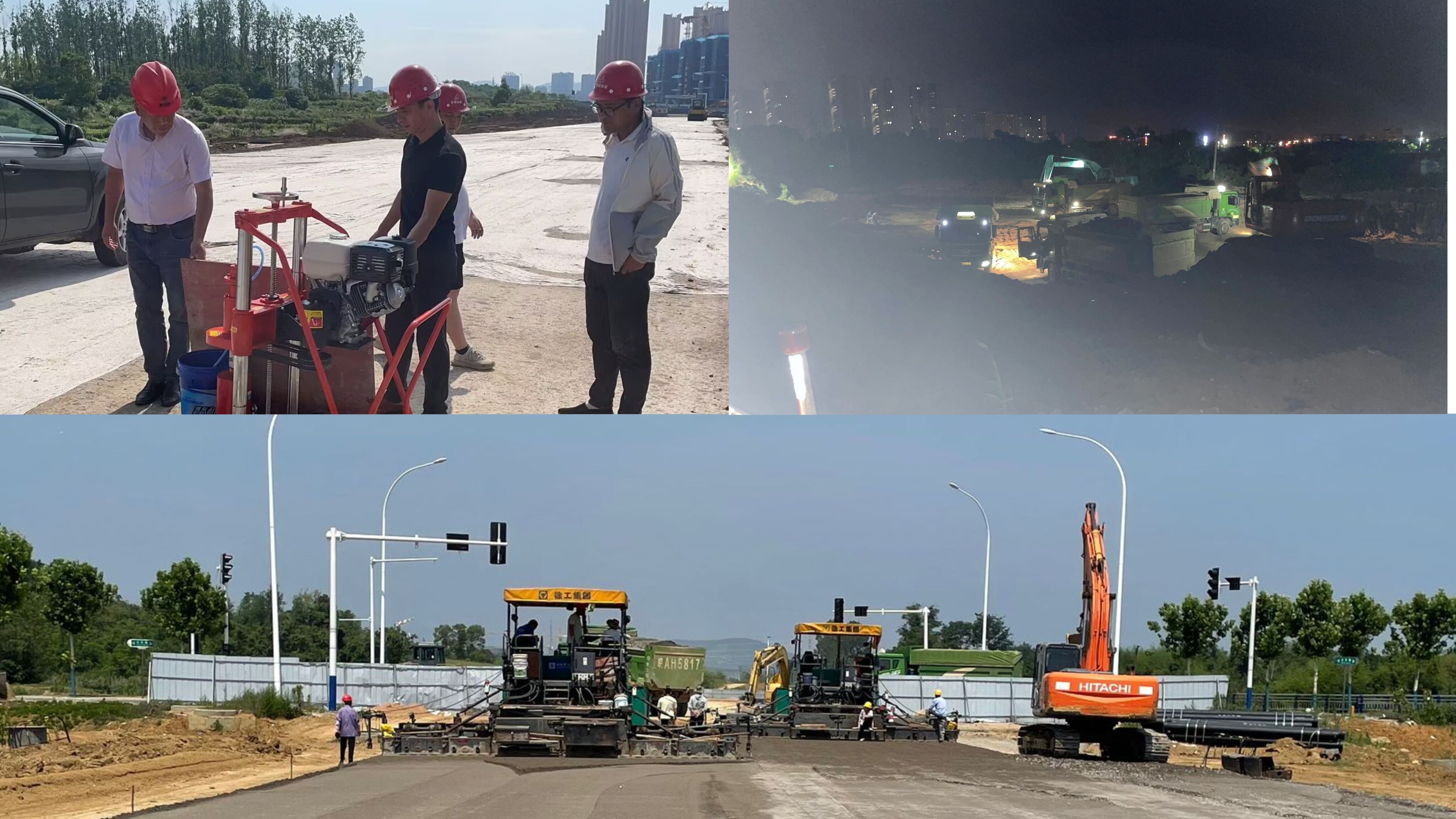 圖為:廬江縣新建立人路(福泉路-城西大道)工程水穩(wěn)取芯試驗、土方夜間外運及快車道水穩(wěn)攤鋪碾壓施工