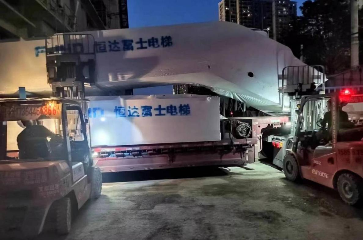 淮北恒大中央公園二期電梯安裝工程施工人員正在夜間卸貨扶梯