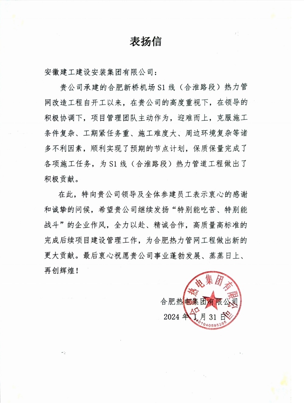 1月31日,合肥熱電集團(tuán)有限公司發(fā)來表?yè)P(yáng)信,就建工安裝集團(tuán)對(duì)合肥新橋機(jī)場(chǎng)S1線(合淮路段)熱力管網(wǎng)改造工程做出的積極貢獻(xiàn)予以充分肯定和真摯謝意。