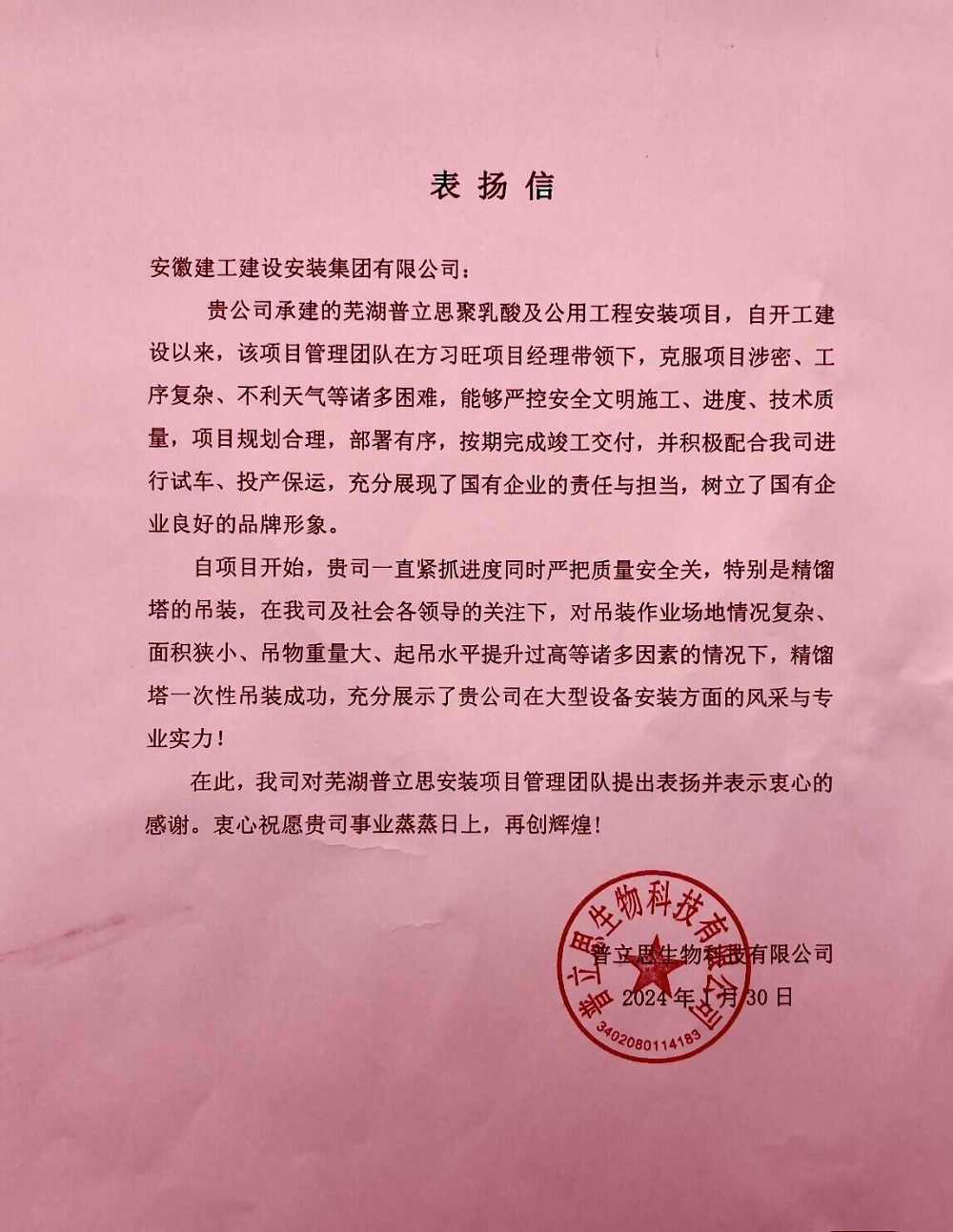 近日,建工安裝蕪湖普立思聚乳酸及公用工程安裝項目收到業(yè)主表揚信,對項目團隊在項目建設(shè)過程中主動作為、攻堅克難,敢于擔當、全力拼搏的精神予以充分肯定和高度認可,對公司及項目全體參建人員的辛苦付出和不懈努力表示衷心感謝和誠摯問候。