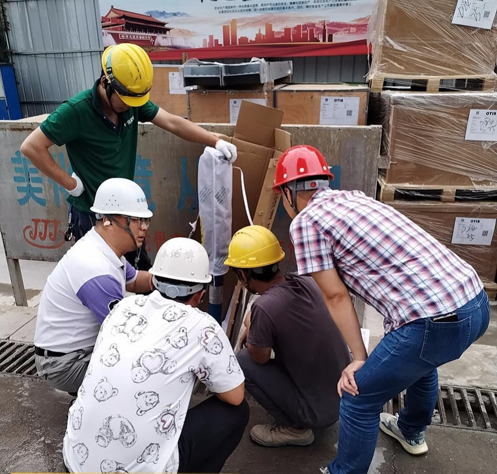 安徽大學綠色產業(yè)創(chuàng)新基地項目現場安裝人員正在進行電梯開箱檢驗