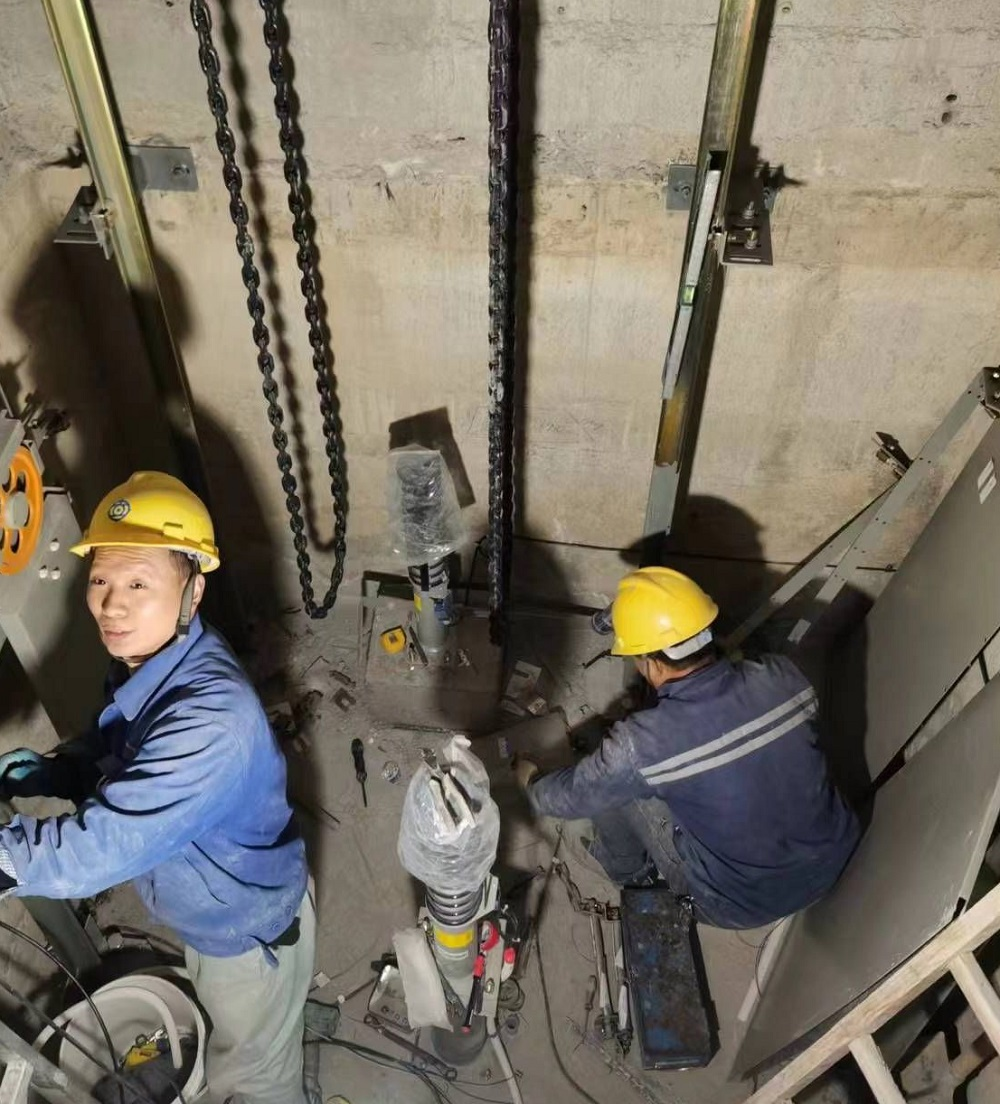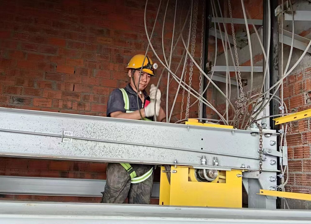 長三角一體化中新蘇滁高新區(qū)高端智能制造產研基地項目現場安裝人員正在收緊鋼絲繩、調整電梯緩沖距離