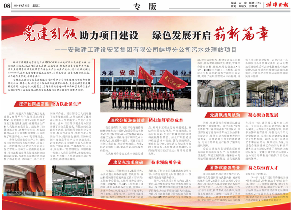 媒體聚焦丨蚌埠日報專版報道安徽建工建設安裝集團有限公司蚌埠分公司污水處理站項目 ——黨建引領助力項目建設 綠色發(fā)展開啟嶄新篇章