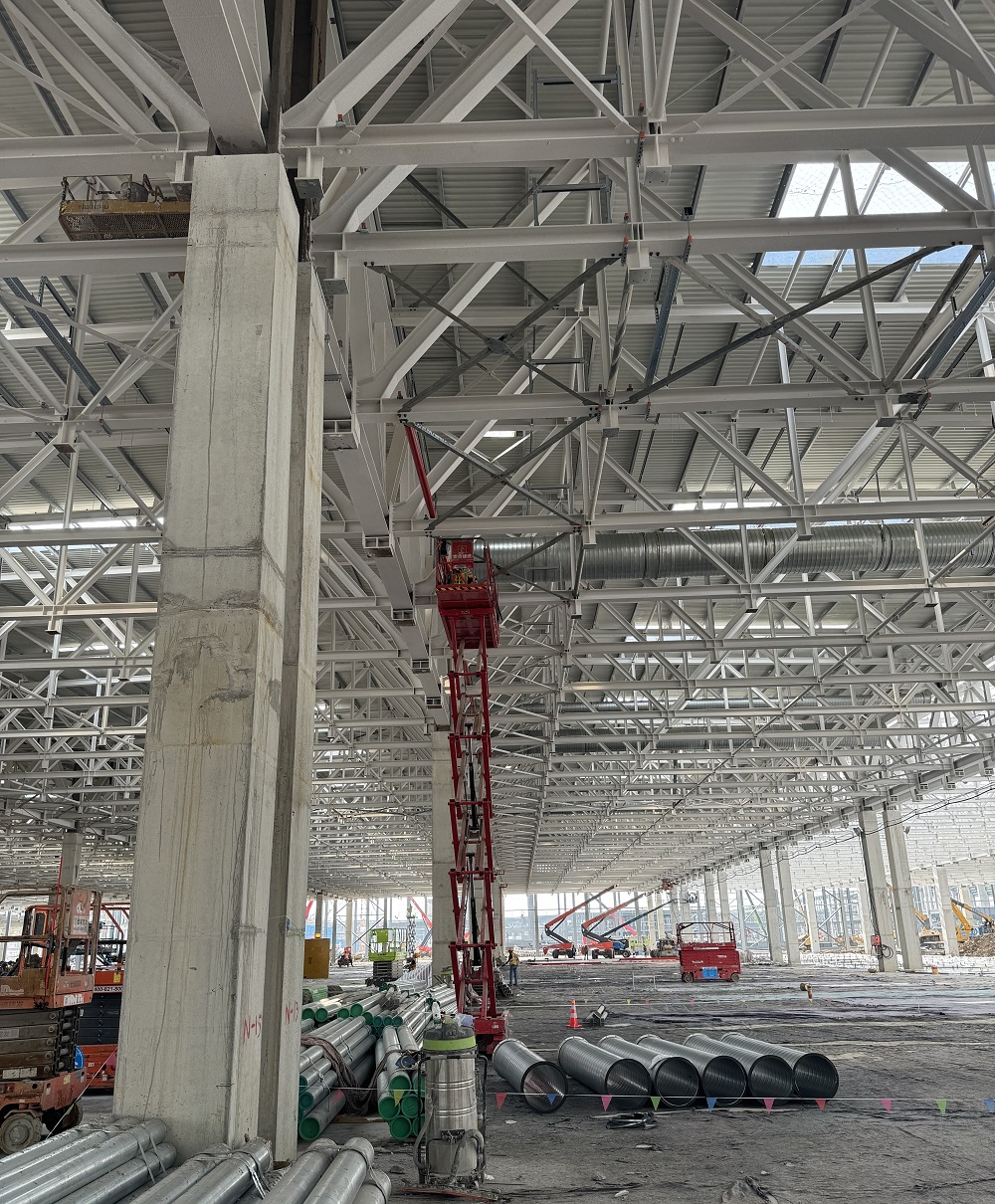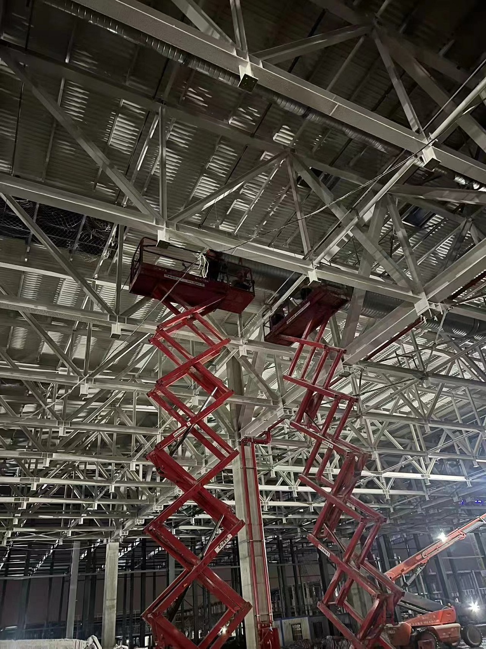 目前正在進(jìn)行車間一1-6區(qū)通風(fēng)管、照明管、橋架、虹吸雨水管、衛(wèi)生間排水管、防雷接地、消防管等安裝作業(yè),材料加工區(qū)預(yù)制各類管道支架也在同步推進(jìn)?,F(xiàn)已完成車間一風(fēng)管安裝約3000平方米,風(fēng)管預(yù)制約8000平方米,虹吸雨水管道安裝約120米,照明配管安裝約2000米,消防管道安裝約320米,防雷接地網(wǎng)安裝約10000米,橋架安裝約400米。