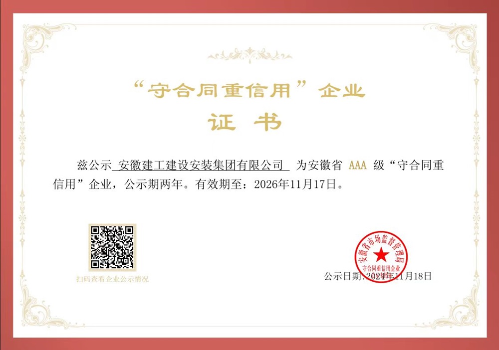 近日,安徽省市場(chǎng)監(jiān)督管理局傳來喜訊,安徽建工建設(shè)安裝集團(tuán)有限公司被評(píng)為安徽省AAA級(jí)“守合同重信用”企業(yè)。