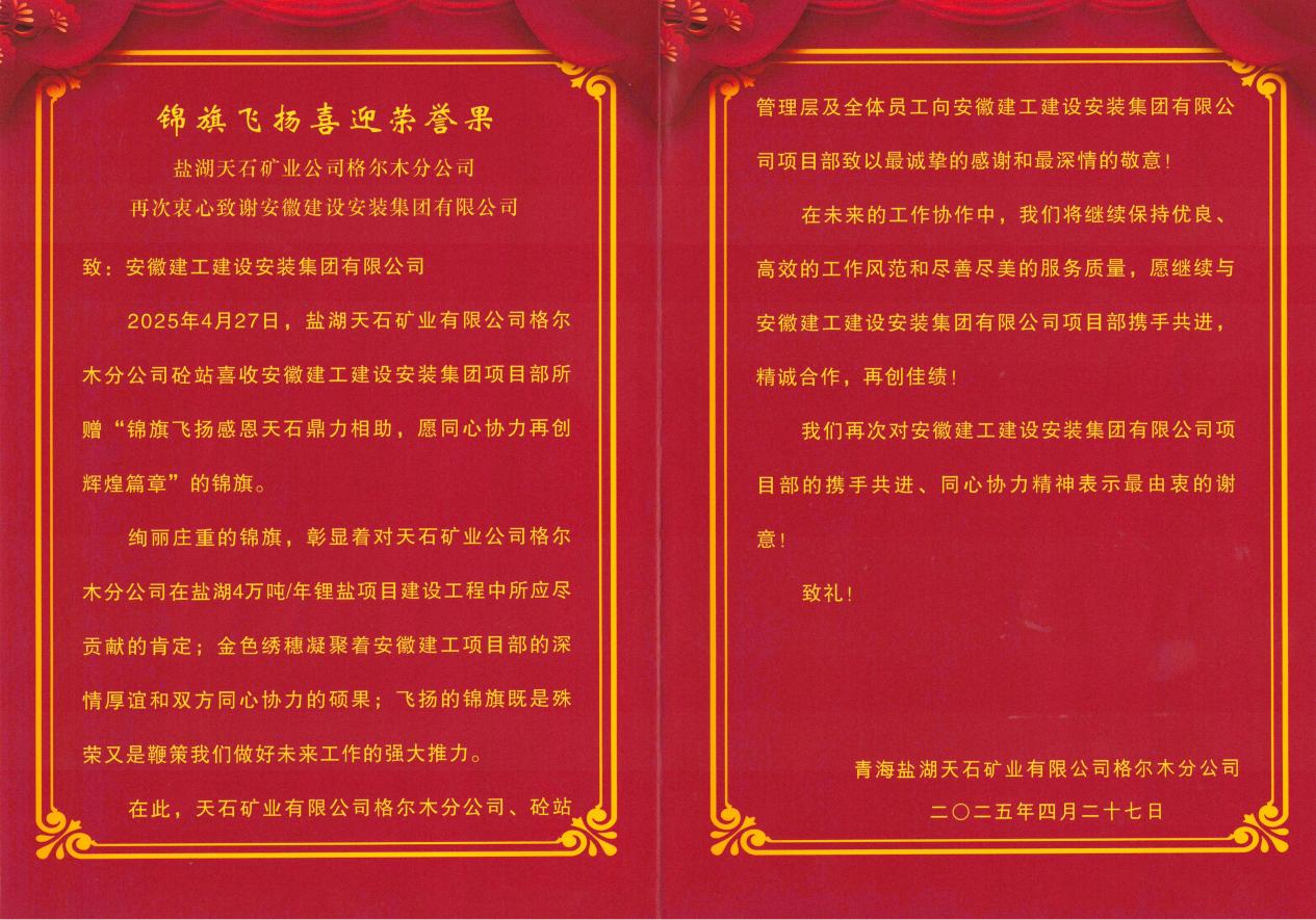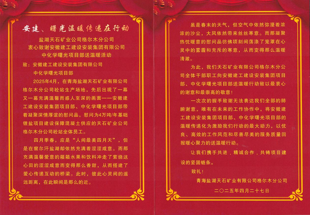 信中,青海鹽湖天石礦業(yè)有限公司格爾木分公司對建工安裝項目部此前慰問砼站全體員工致以最誠摯的感謝,愿繼續(xù)與建工安裝項目部攜手共進、精誠合作、再創(chuàng)佳績!這封感謝信不僅是對項目部過往成績的肯定,更是一份振奮人心的激勵。建工安裝將繼續(xù)保持高昂斗志和嚴謹態(tài)度,加強與相關(guān)單位溝通協(xié)作,強化項目管理,確保項目按期、高質(zhì)量交付,為打造世界級鹽湖提鋰產(chǎn)業(yè)基地貢獻力量!